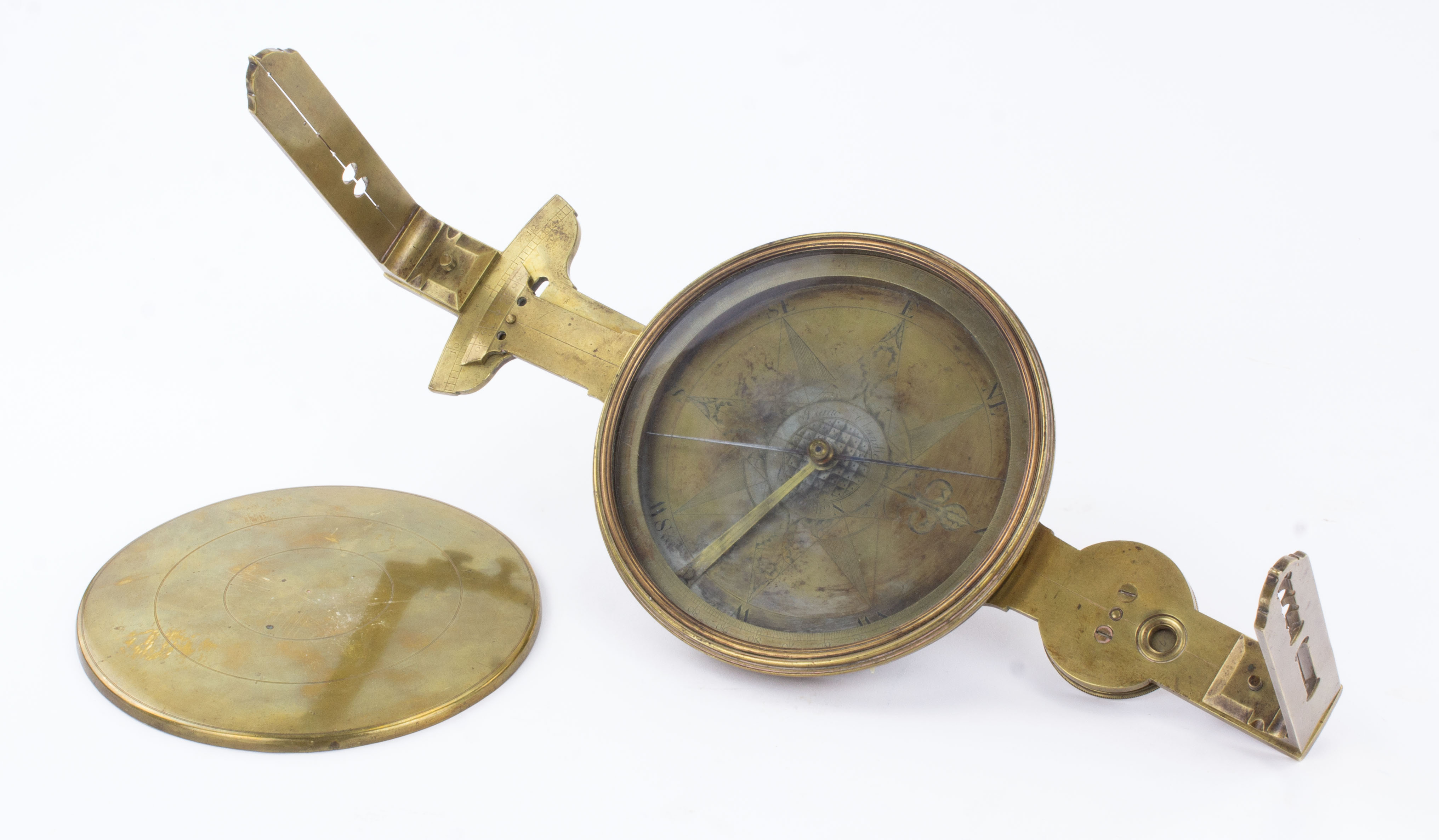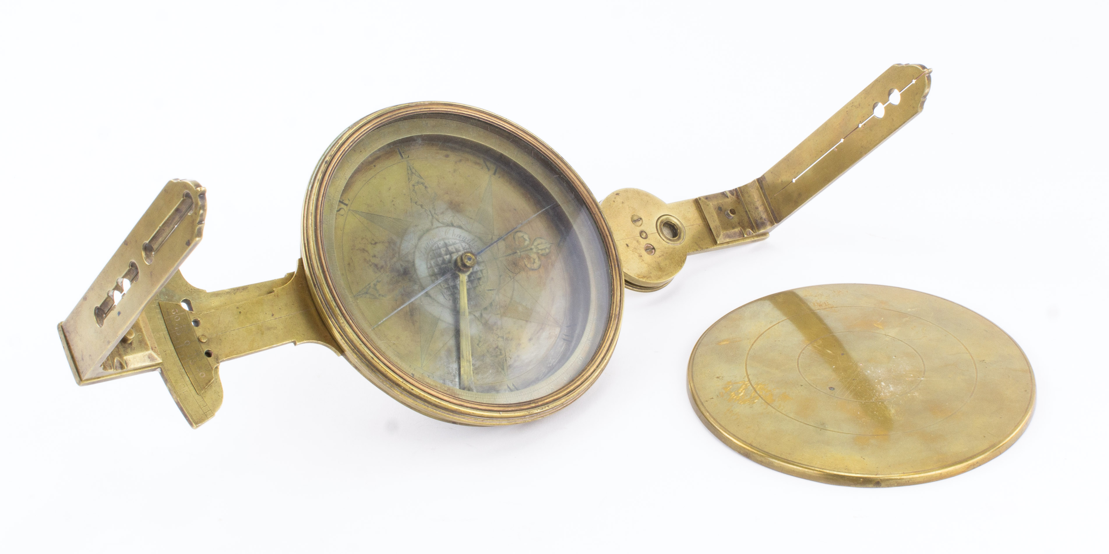 B68-529 VERNIER COMPASS. Isaac Chandlee. 4-1/2" needle, brass dial with no levels, tally counter in south arm, sighting vanes. Engraved "Isaac Chandlee, Nottingham," around center dial with fleur de lis at north. Isaac Chandlee was the younger brother of Goldsmith Chandlee, and was also one of the three instrument maker sons of Benjamin Chandlee, all of whom were included in the famous "Six Quaker Clockmakers" of revolutionary era America; his working years were 1790 to 1813 and instruments made by him are uncommon. Good 1000-2000