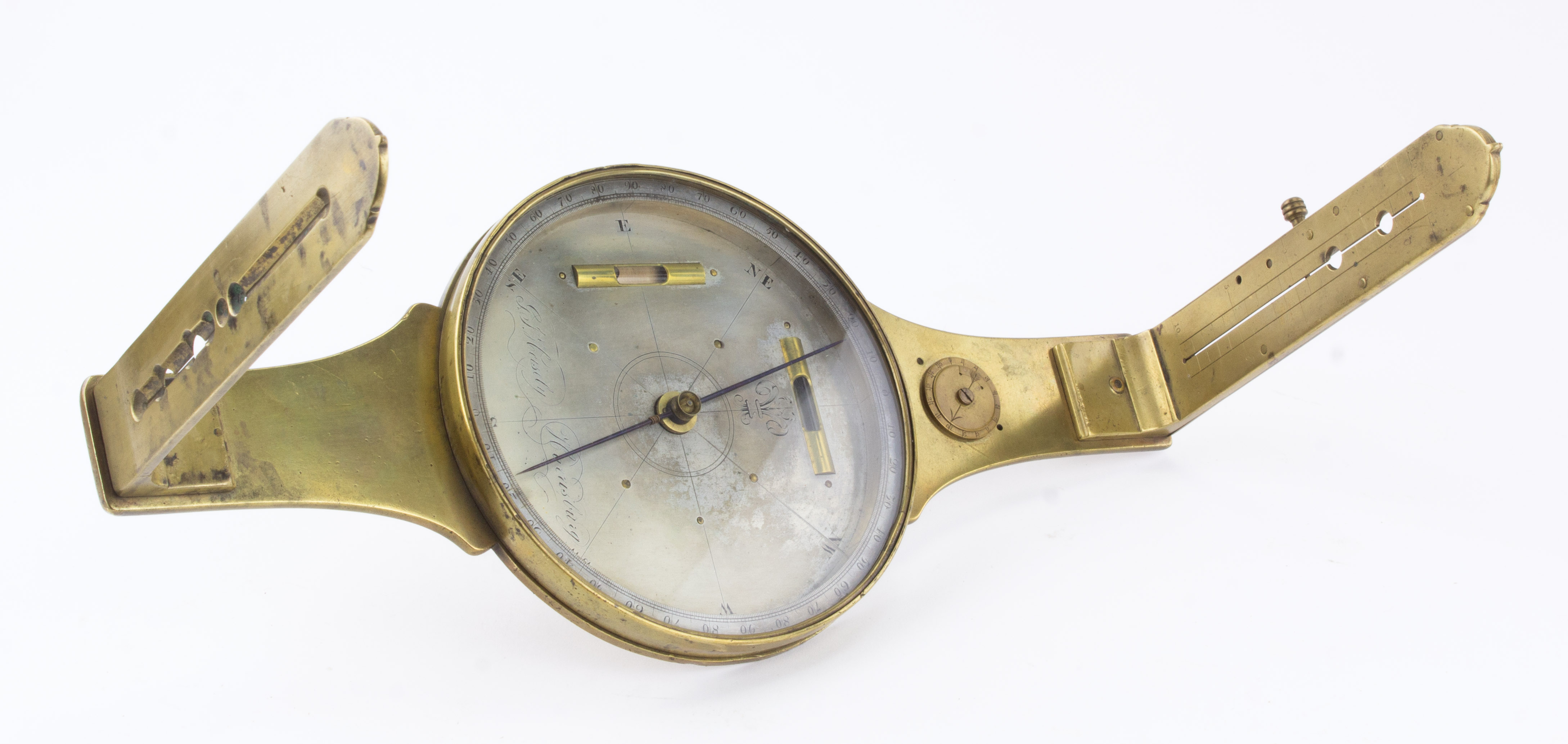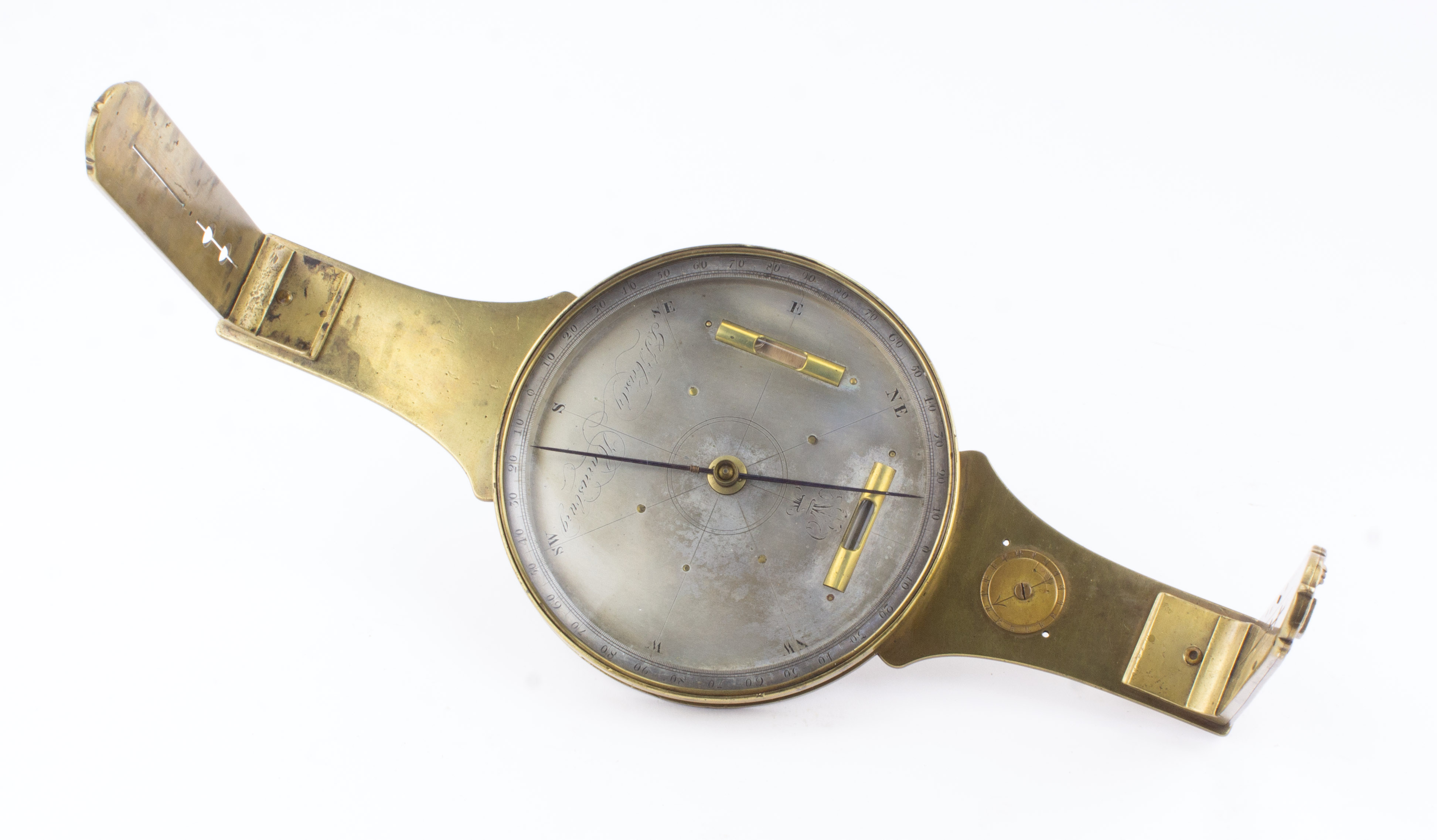 B68-530 SURVEYOR'S PLAIN COMPASS. G.J. Heisley. 5-1/4" needle, silver dial with fleur de lis at north and "G.J. Heisely, Harrisburg" at south. Crossed levels in dial, tally counter in north arm. One of the sighting vanes has an unusual adjustment feature. No cover for dial. George Jacob Heisley was one of the sons of Frederick Heisley; in addition to his long career as an instrument maker he had the distinction of serving in both the War of 1812 and the Civil War, and is credited with having suggested to Francis Scott Key the tune for the poem that would become the Star Spangled Banner. Elaborate and well made. Good+ 150-300