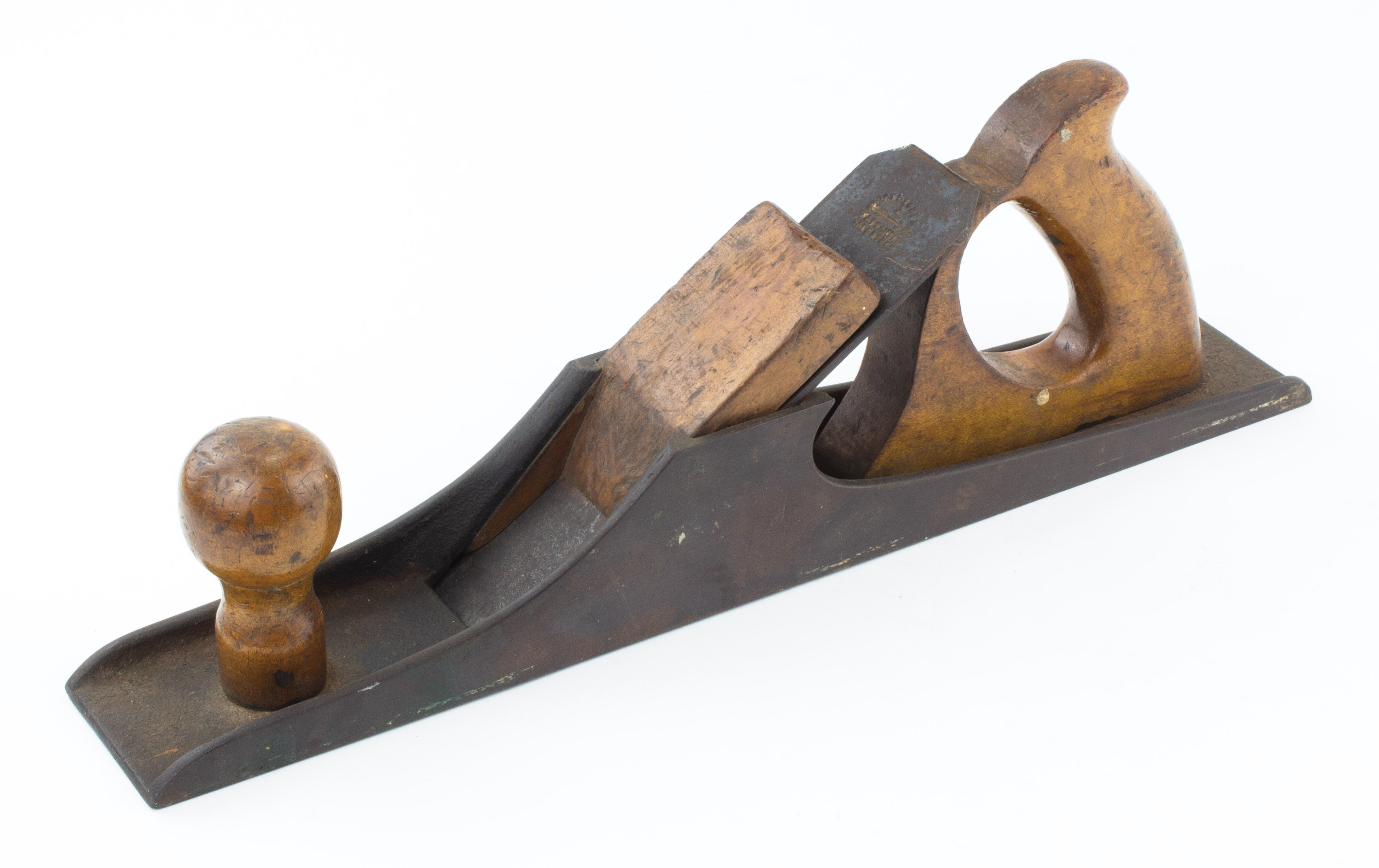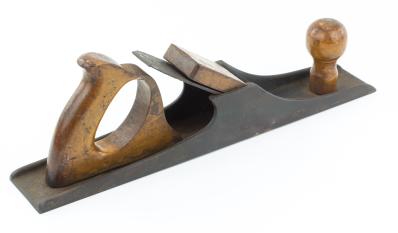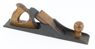 B68-533 JACK PLANE. Knowles Type. Good early example. Unmarked, but very similar to PTAMPIA II, Figure 6, but with the tote screwed directly to the bed rather than in a socket as in the original Knowles patent. 15-1/4" sole, 2" cutter, birch tote, wedge and knob. Tip of tote rounded. Wood has light wear, metal oxidized but no rust or pitting. From the collection of Harold Unruh. Good+ 200-400