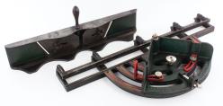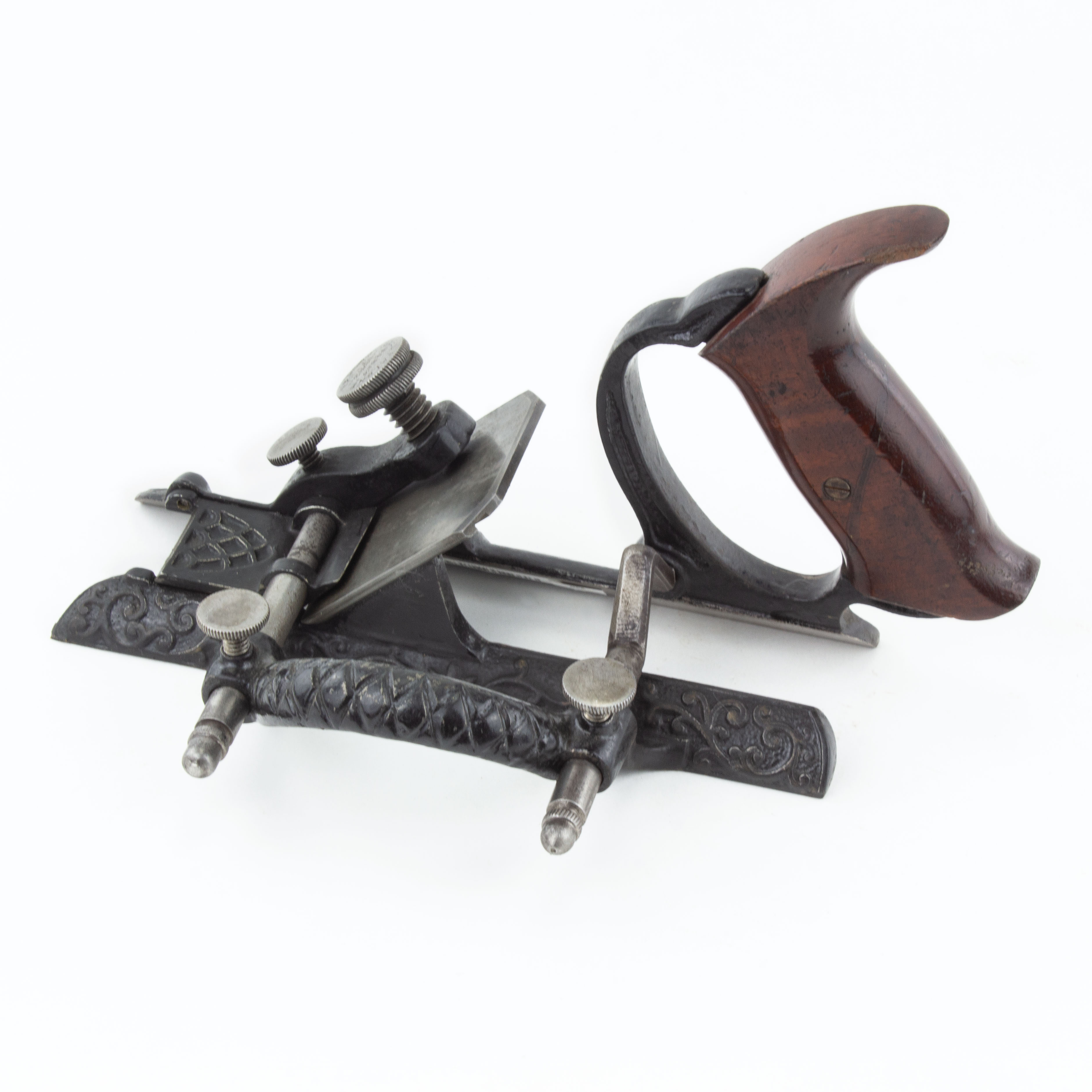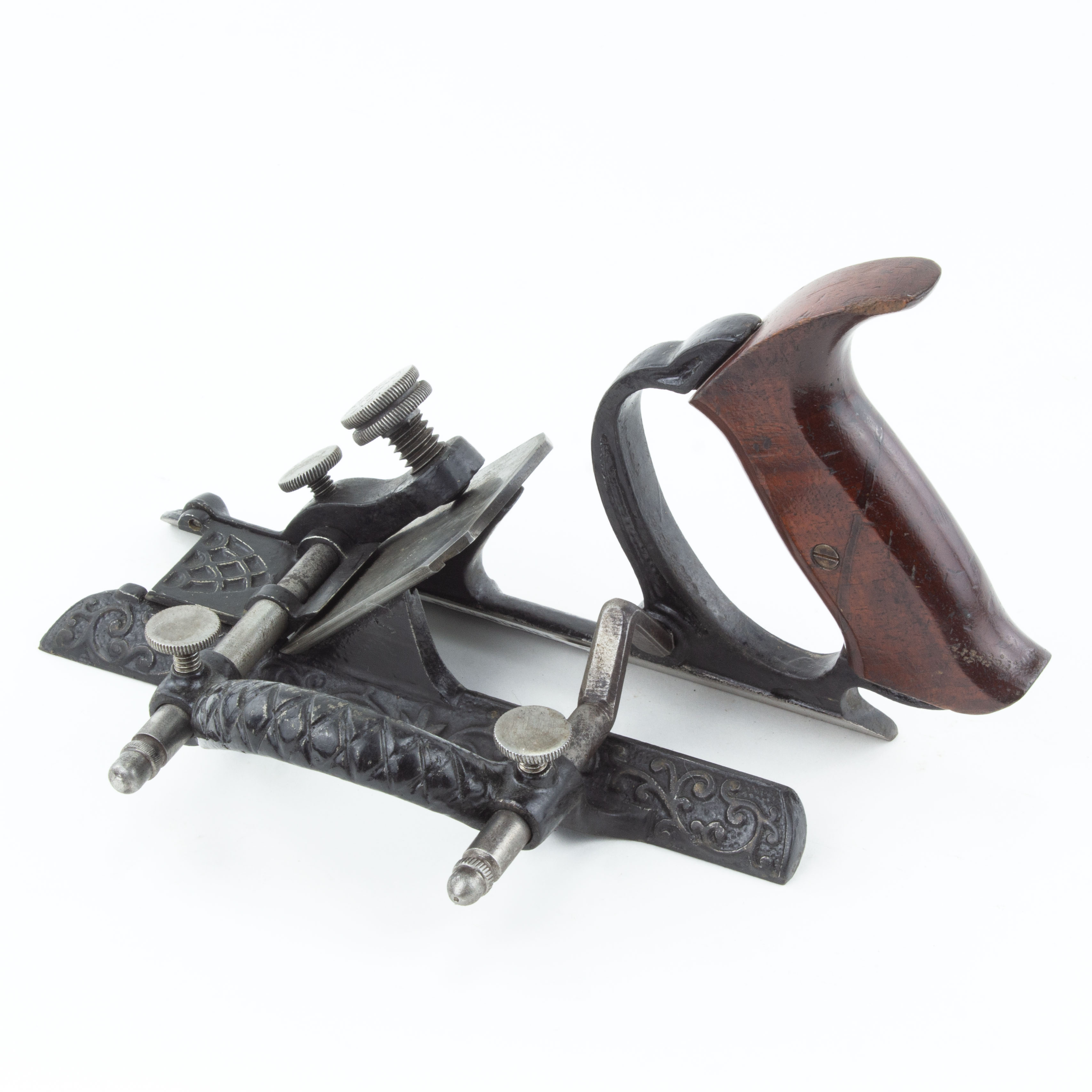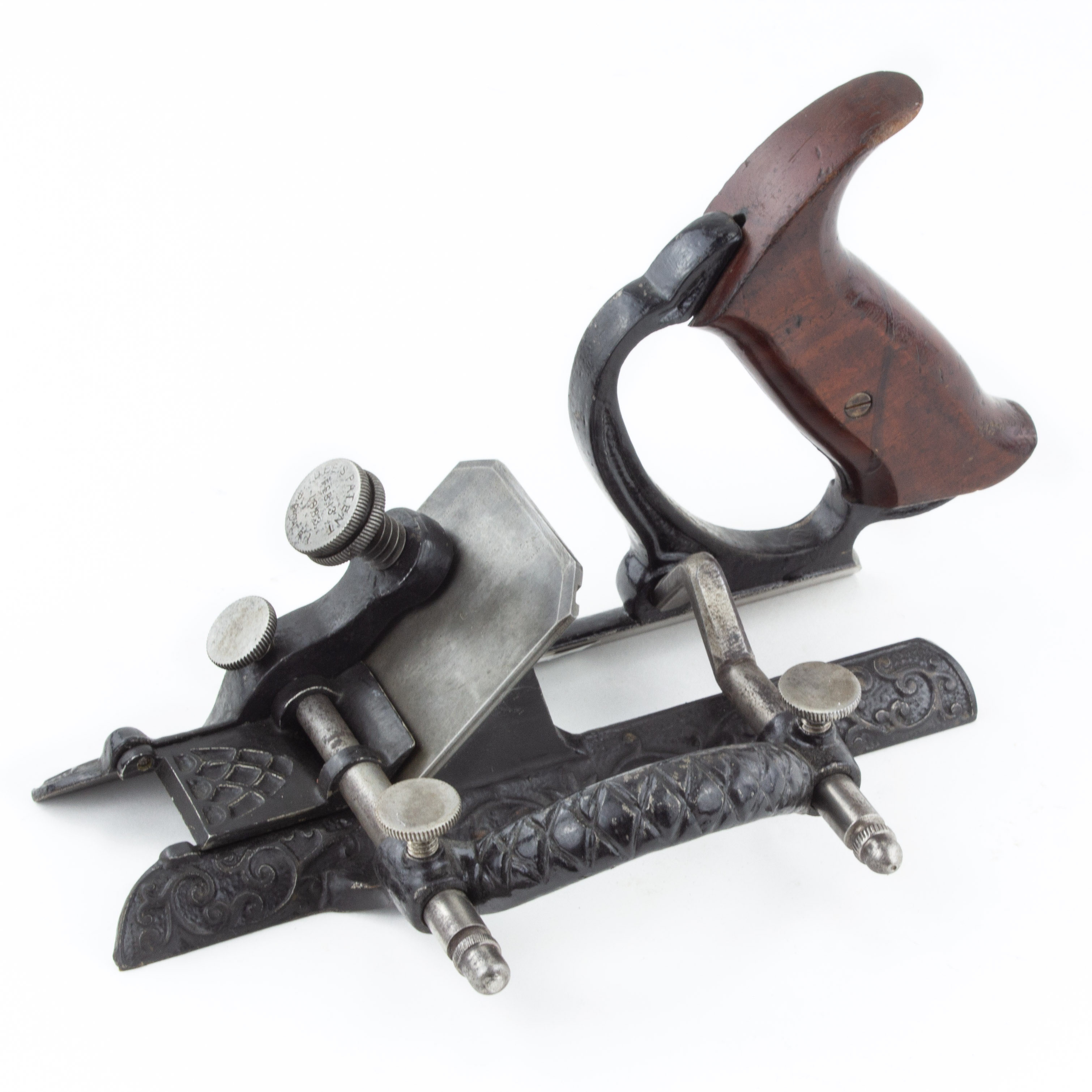 B68-536 STOP CHAMFER PLANE. Lee Patent. Cast iron version of Joseph Lee's iconic stop chamfer plane. Lee was constantly fiddling with the design and it sometimes seems that no two are alike; this one has a rotating cutter clamp that is closer to the original patent than the church-window design found on some later planes, and arms with decorative acorn finials. Lee's name and patent date and number are cast into the body and lever cap, but not marked with manufacturer Thurston, all of which leads us to believe it's an earlier model. Japanning fully intact, slight wear to tote. One of the nicest examples we've seen. From the collection of Harold Unruh. Fine 2000-4000