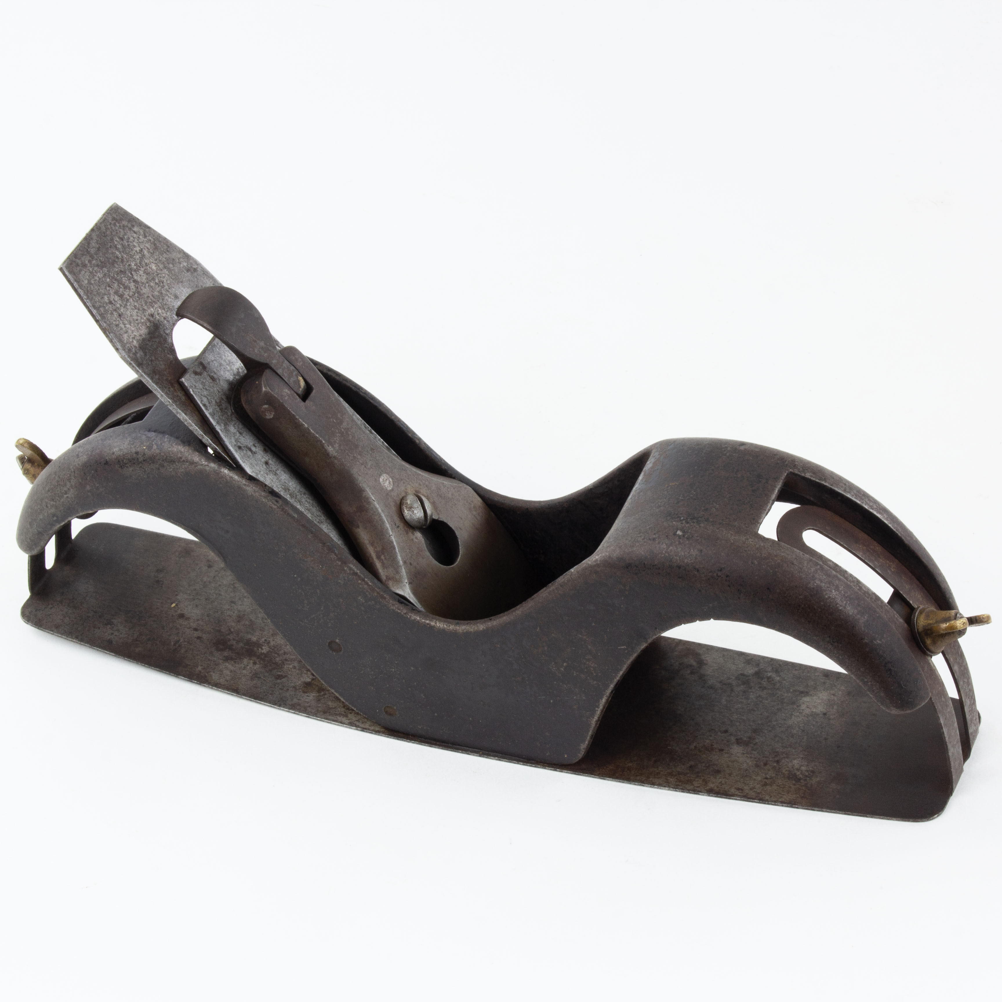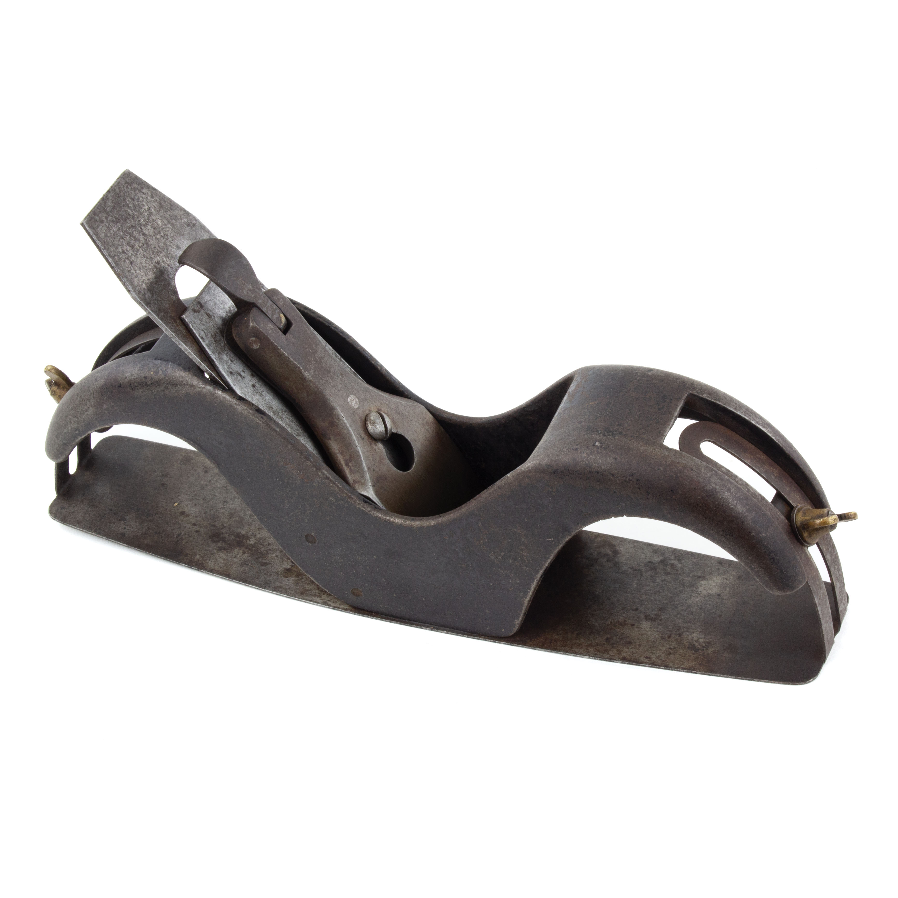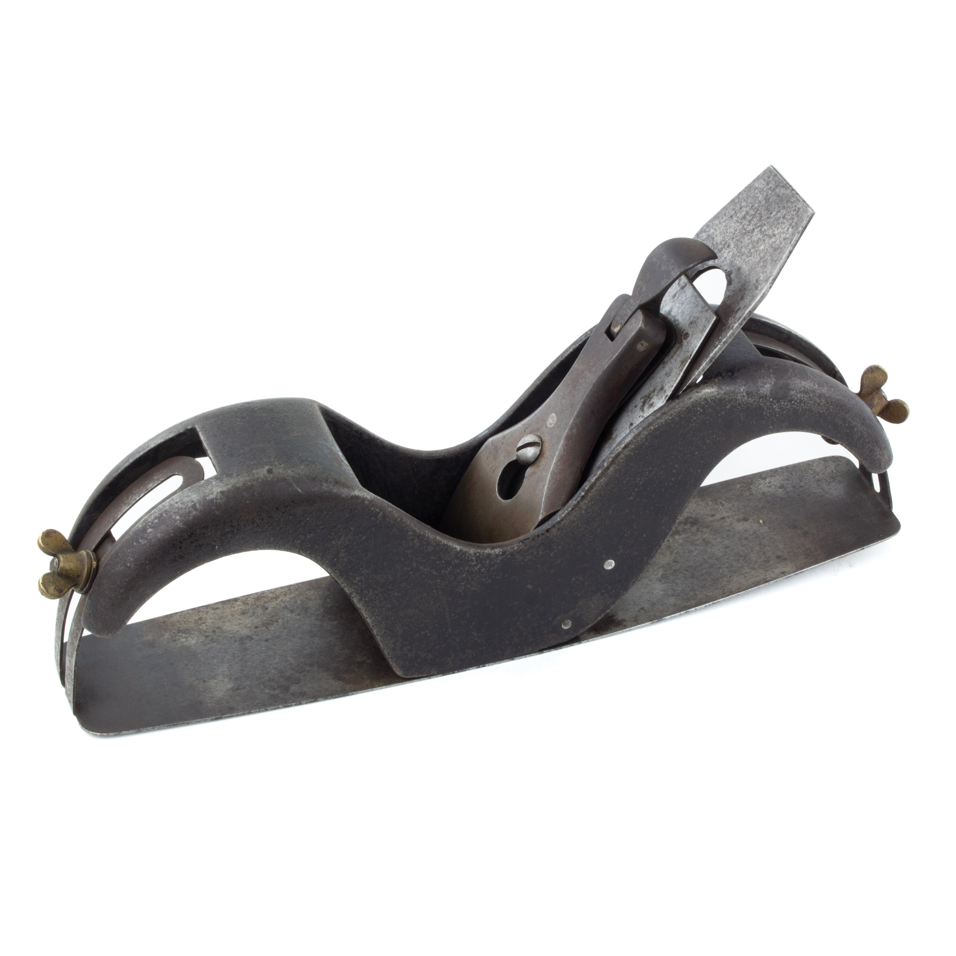 B68-540 FLEXIBLE SOLE PLANE. Type 1 Stanley No. 13. Extremely rare example of the version of the No. 13 manufactured by Stanley prior to Bailey's 1871 patent, with the bent strips at the ends of the sole and solid brass adjustment knob. PTAMPIA I, Figure 294. Japanning 40%, a few light spots of rust on the sole, cutter is marked L. Bailey. From the collection of Harold Unruh. Good+ 1000-2000