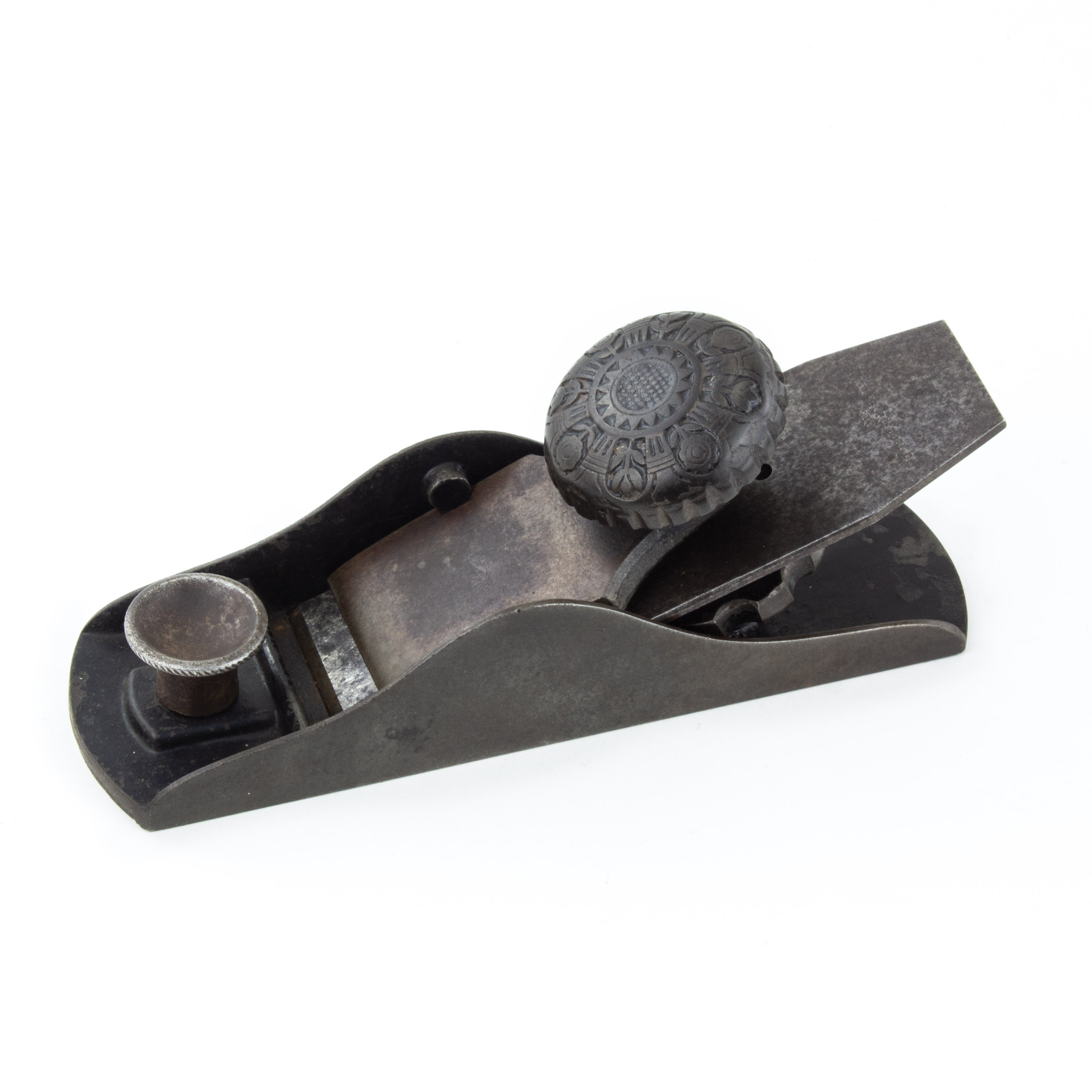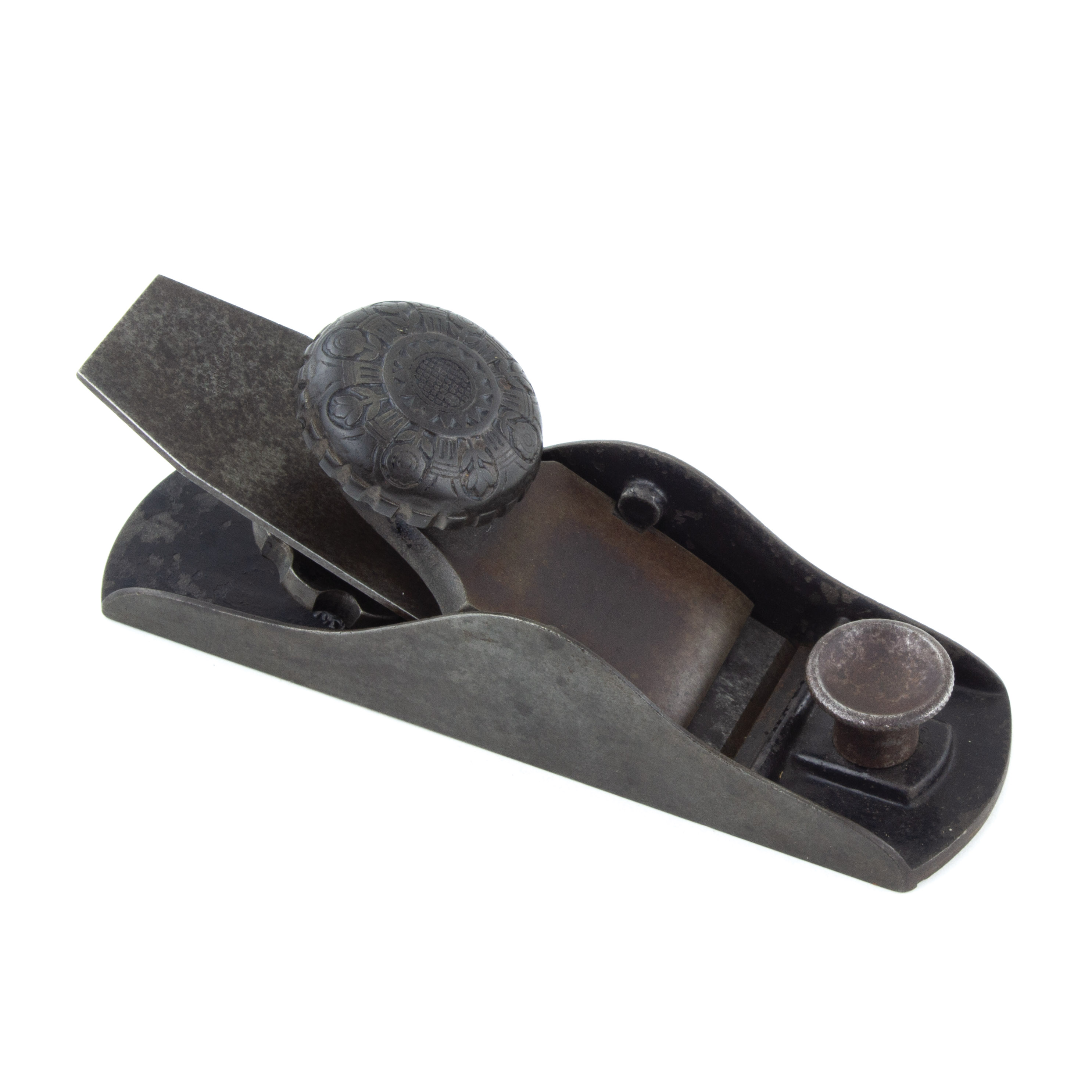B68-541 BLOCK PLANE. Brattleboro Tool Co. The plane shown in Figure 217 of PTAMPIA II. 6-1/2" sole, adjustable throat, decorative floral cap screw, cutter adjustment based on William Steers' 1885 patent. Original marked 1-5/8" cutter. Metal clean and rust free. One of the rarest of the Steers patents. Good+ 300-600