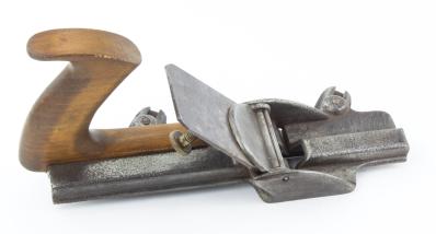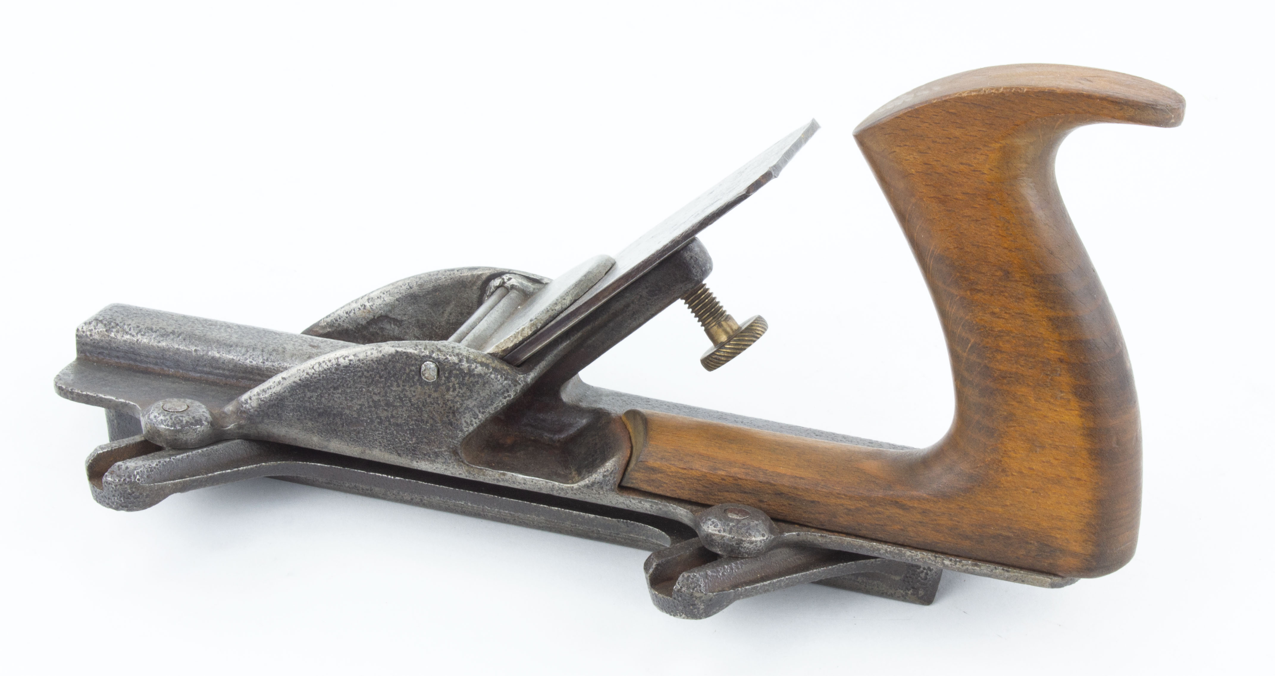 B68-545 TONGUE PLANE. Loughborough Patent. Rare even by the standards of Loughborough planes, this is based on his second patent, issued in 1859. The patent was for a filletster, with a cast iron fence with diagonal slot and U-shaped lever cap, but he also manufactured a tongue-cutting version. See PTAMPIA II, page 42. Wood and metal in immaculate condition. From the collection of Harold Unruh. Fine 2000-4000