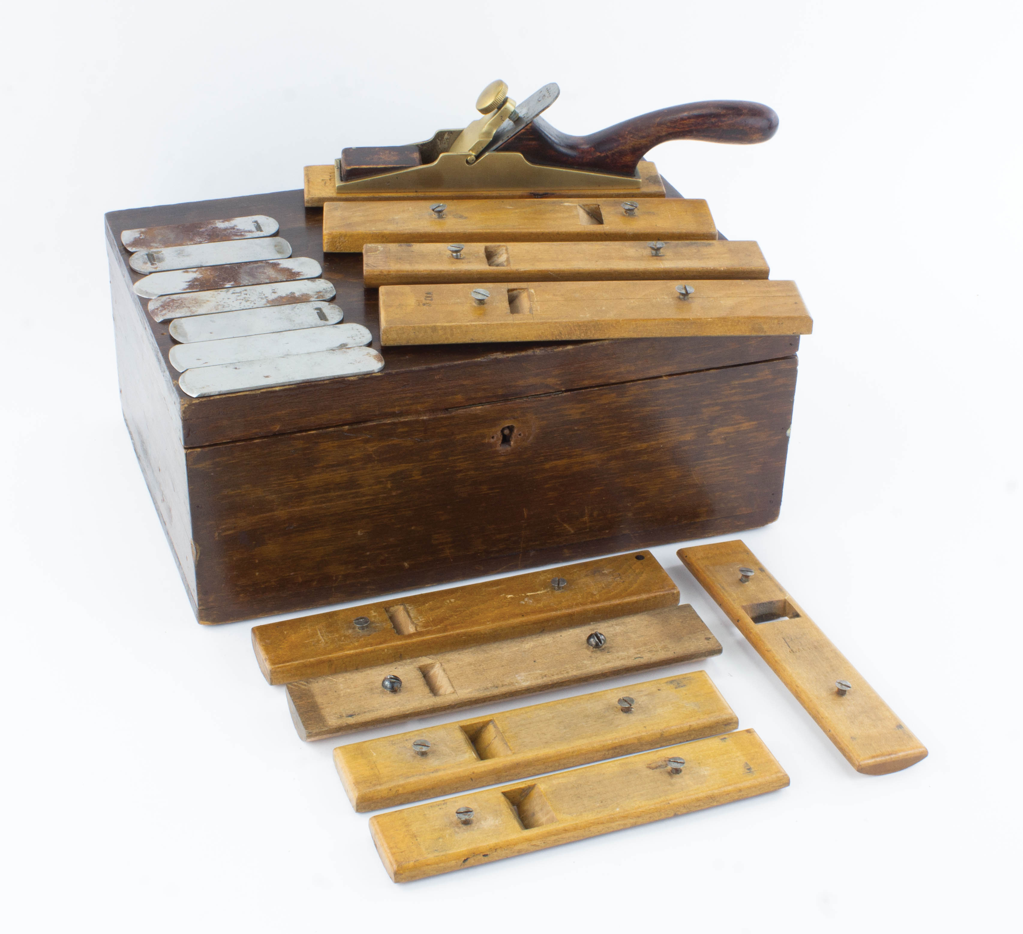 B68-552 PATTERNMAKER INTERCHANGEABLE SOLE PLANE. Unsigned and craftsman made. 7" cast brass body with stained wood squirrel tail handle, slip-in brass lever cap. Comes with nine interchangeable wood bottoms, but only eight cutters. In a repurposed wooden box. Unsigned as usual but very well made. From the collection of Pat Gefre. Good+ 100-200
