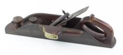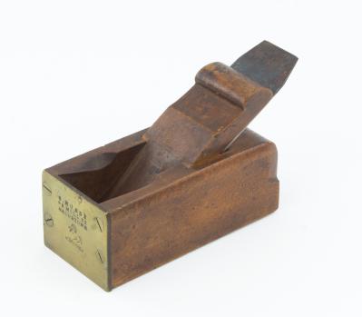 B68-556 BULLNOSE PLANE. C. Nurse. Very uncommon small block plane 4-1/2" long, with brass toe plate and 1-3/8" Thos. Ibbotson iron with scroll wedge. Red beech with very light wear. The brass plate is stamped with Nurse's Mill Street address and "Invicta" mark; it's been polished but is toning down. Good+ 75-150