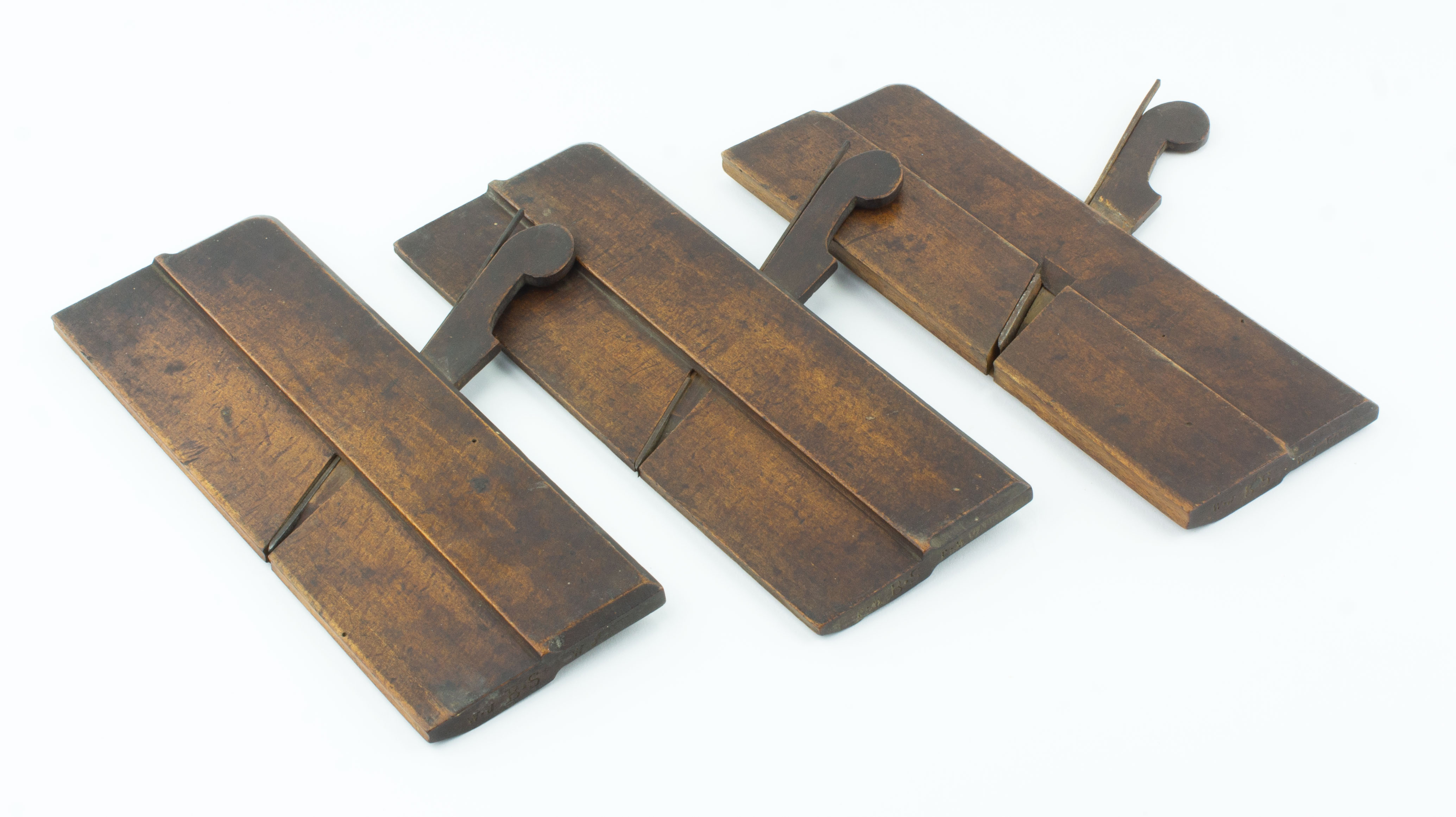B68-557 LOT OF THREE EIGHTEENTH CENTURY BRITISH MOLDING PLANES. Christopher Gabriel. Nos. 3, 4 and 6 hollows, from the same set of hollows and rounds with the same owner's mark. 9-1/2" long, wood well oxidized with very light wear including a couple of inactive worm holes. Good+ 60-120