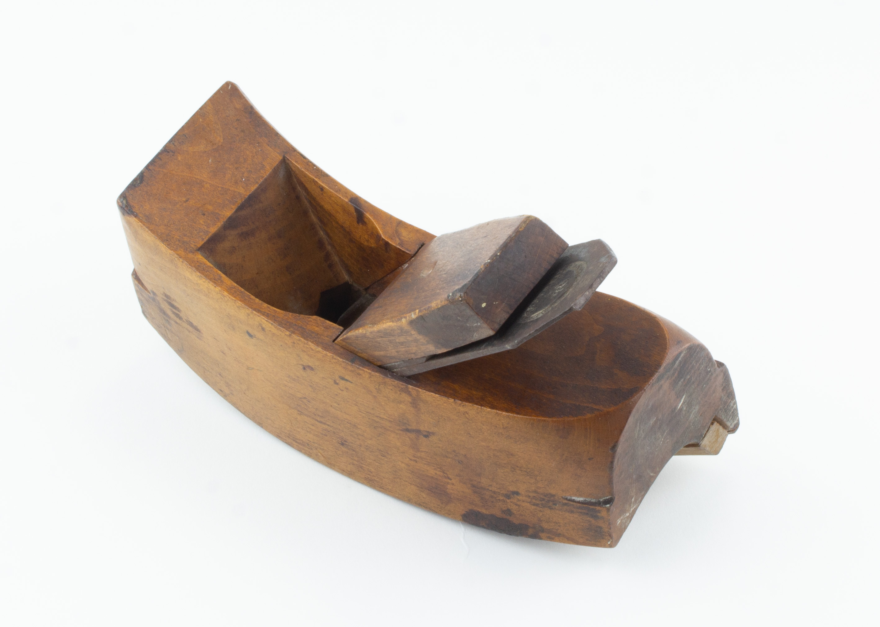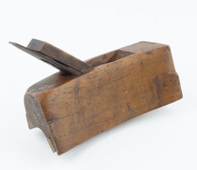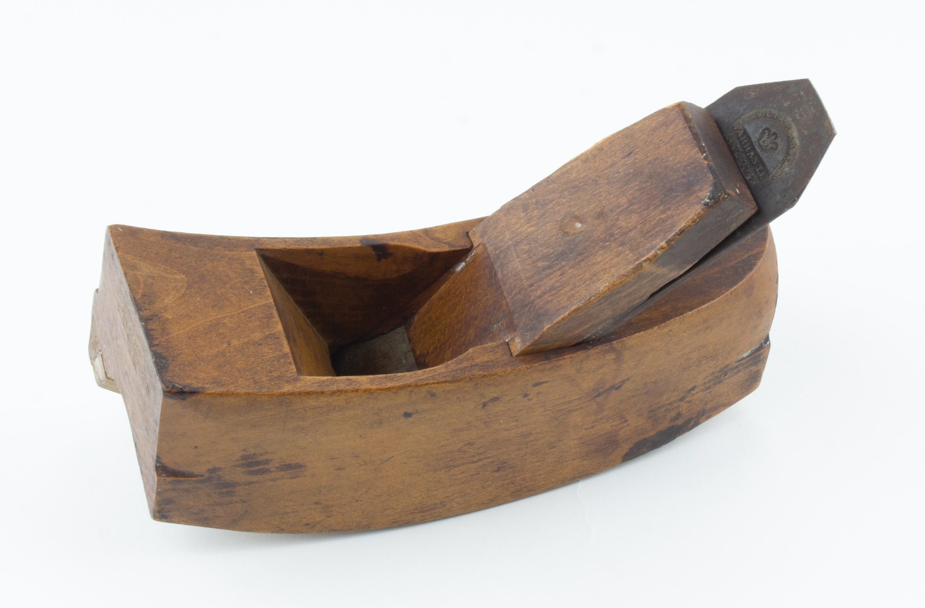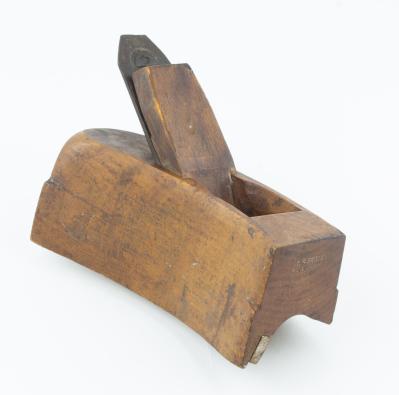 B68-558 STAIR RAIL PLANE. L.S. Soule. Curved body with concave sole, 8" long with 1-3/4" Wm. Ash cutter. Applied wear strip on inside of sole. A1 mark, three stars. Wood has light wear and some small stains. From the collection of Steve Dice. Good+ 60-120