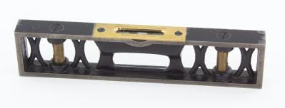 B68-564 CAST IRON MACHINIST'S LEVEL. Rabone & Sons. 9" long with shafting groove, japanning 90%, adjusting screws in bottom. A nice example of an uncommon English level. From the collection of Jim and Becky Leamy. Good+ 80-160