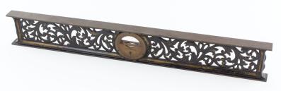 B68-570 TALL FRAME INCLINOMETER. L.L. Davis. The earliest version of Davis' iconic cast iron inclinometer, 3-1/4" tall with the heavier cast filigree. 24" long. Gold pinstriping is mostly intact around the edges and there are traces on the filigree. Brass inclinometer insert is clean with the often missing pointer, vial intact. A very nice example of a classic collectible tool. Good + 300-600