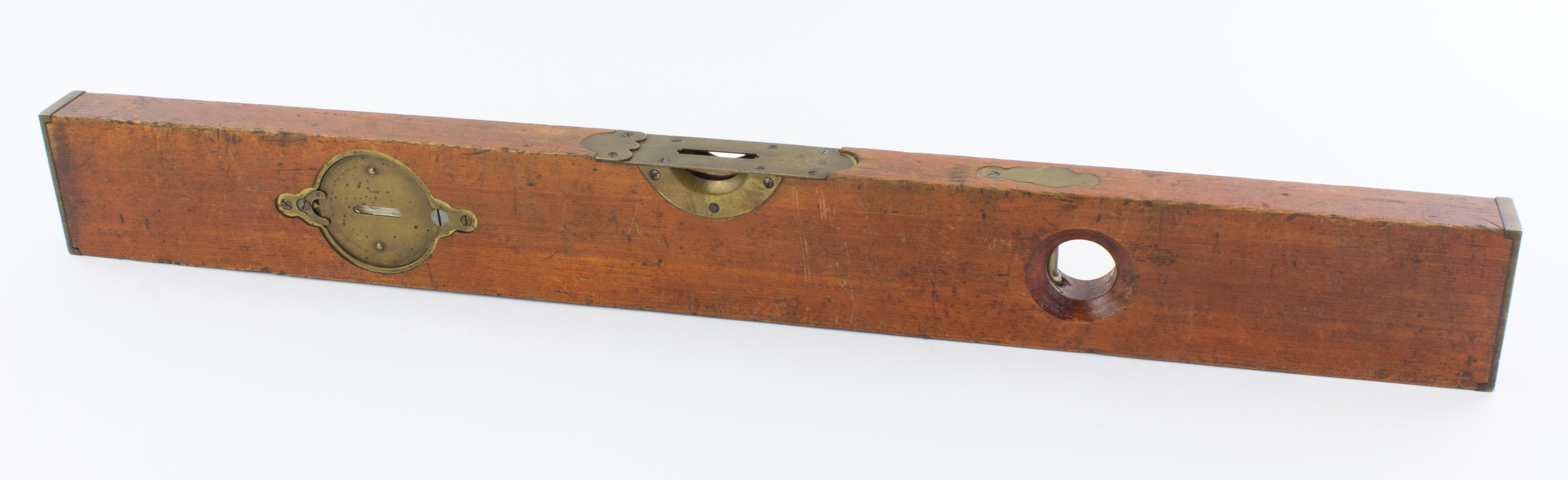 B68-571 INCLINOMETER. Disston & Morss. This rotating brass inclinometer dial was sold by Disston & Morss as an accessory that could be attached to any Disston level; this one is attached to a 28" cherry level marked by D&M. Wood has light overall wear. Brass very clean. Good + 100-200
