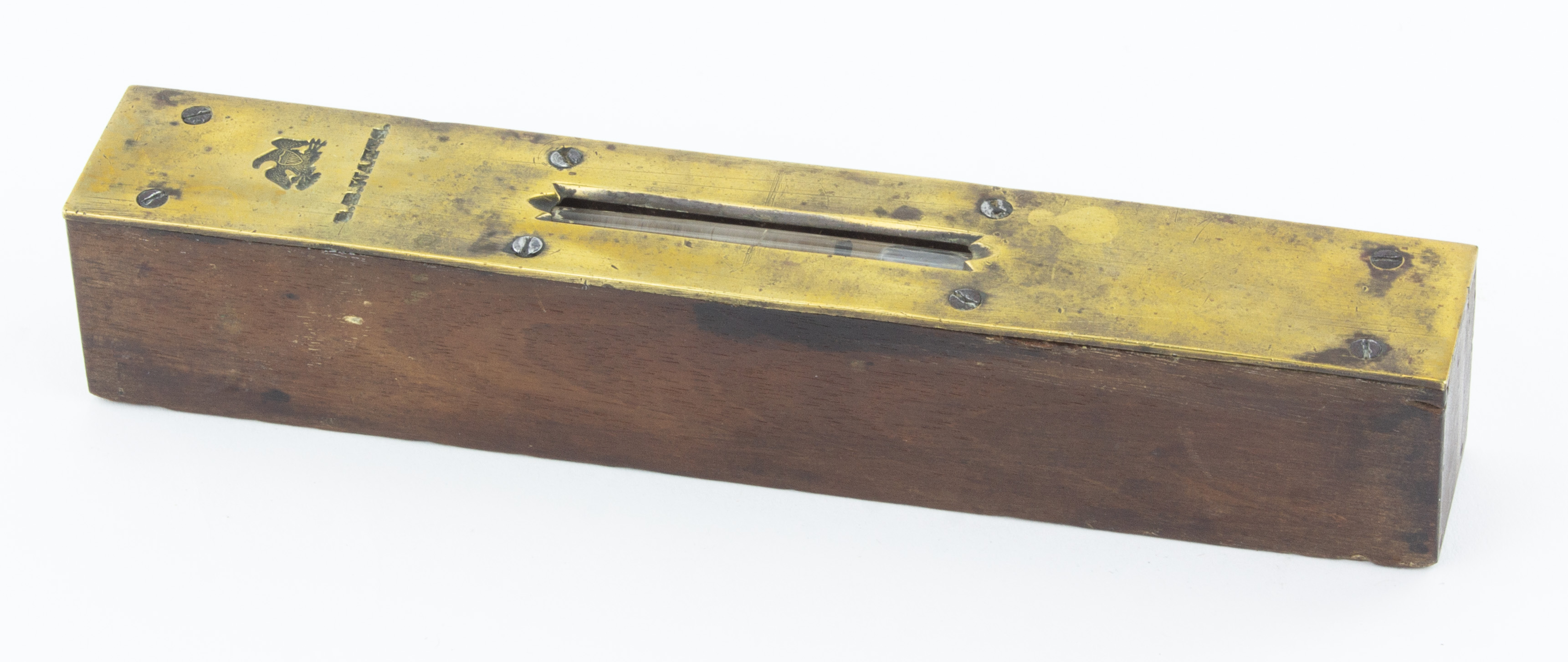 B68-575 LEVEL. L.B. Watts. 8" mahogany stock, full brass top plate with good clear eagle stamp; vial wet, all screws original, a few stains on wood and mild tarnish spots on plate. Watts was one of Boston's earliest level makers and this is a clean example of his work. Good 60-120