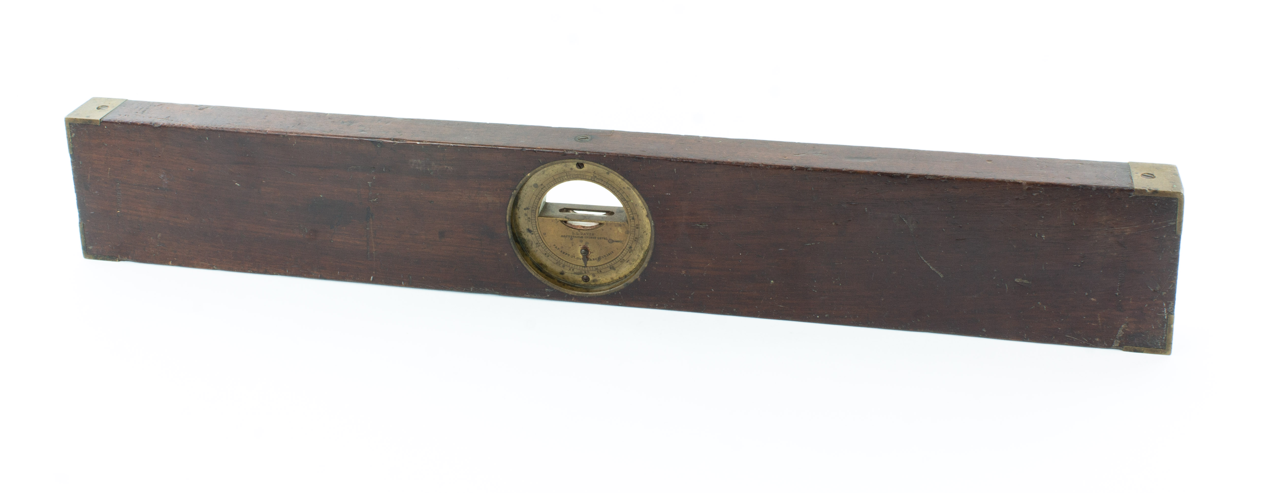 B68-578 INCLINOMETER. L.L. Davis Tall Frame. Very clean example of the mahogany version of Davis' original large diameter inclinometer, 24" long, 3-5/8" tall with all original brass. The wood has some minor dings and scratches; the dial has some light corrosion with original pointer. The wooden versions of the tall frame are actually rarer than the cast iron filigree versions and this is a very nice example. Good+ 300-600