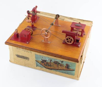 B68-585 MODEL OF PULLEY-DRIVEN WORKSHOP. Jensen Mfg. Co. IOB. Includes five machines and central pulley system. Some marked by Jensen Manufacturing of Jeannette, PA, who make model and toy steam engines since 1932. All mounted on 13-1/2" by 11-1/2" board, all clean and works smoothly. Good+ 50-100