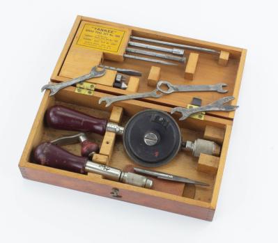 B68-594 MULTI-TOOL KIT. Yankee Radio Tool Set No. 106. The most complete set of one of North Brothers' least common tools, marketed in the 1920s specifically to be used on new-fangled radio sets. In this case, the No. 105 set has been combined with a No. 1431 Radio Drill in an expanded version of the kit. Includes a ratchet screwdriver, three blades, countersink, two sockets, a reamer, a wire bender, and a single-end hex wrench plus a drill. Everything shows little to no use, box intact with 75% label. No Yankee collection is complete without one. From the collection of Pat Gefre. Good+ 150-300