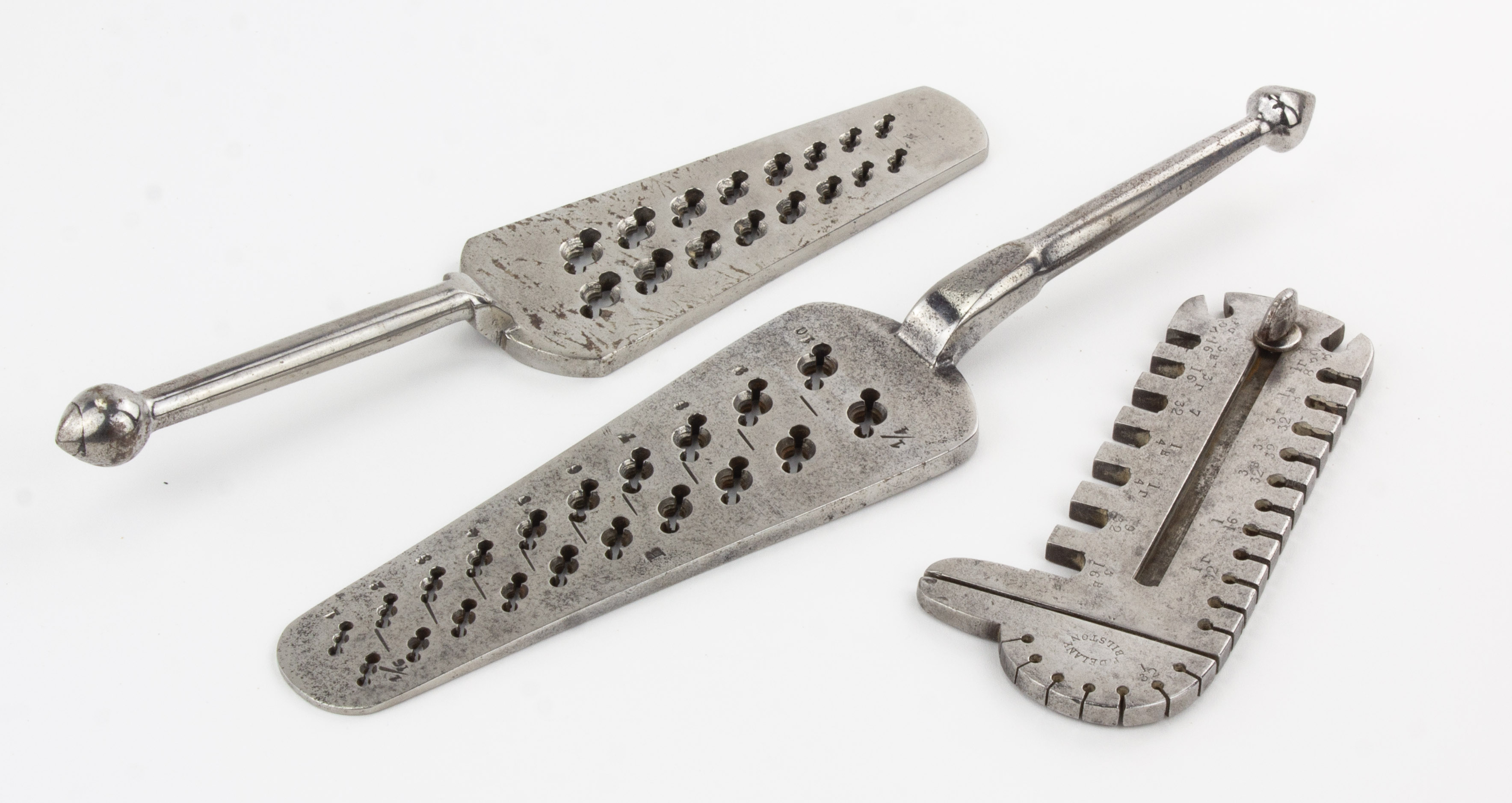 B68-595 LOT OF THREE JEWELER'S TOOLS. Two tap plates, one 10" and one 8", unmarked but appear to be by same maker. And a wire gauge with sliding caliper marked P. Delany, Bilston. Light surface corrosion but overall clean. Good 40-80