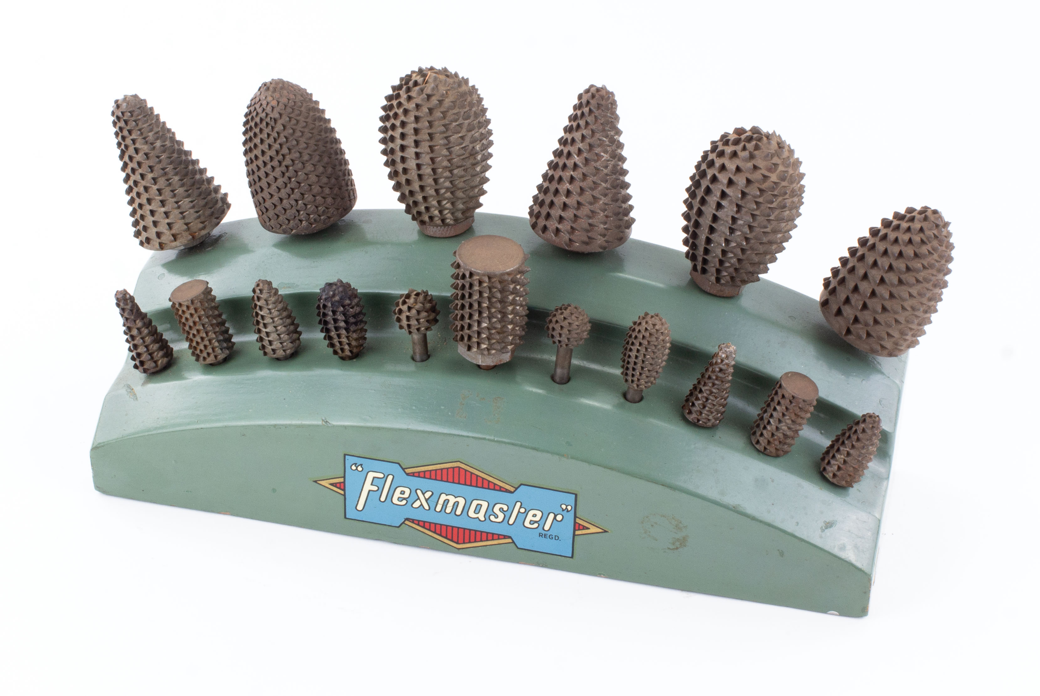 B68-599 HARDWARE DISPLAY. Flexmaster. 12" long and 7" high, green and red paint fully intact. Includes full set of 17 knurled heads of different shapes and sizes. From the collection of Jim and Christa Schoenky. Good+ 100-200