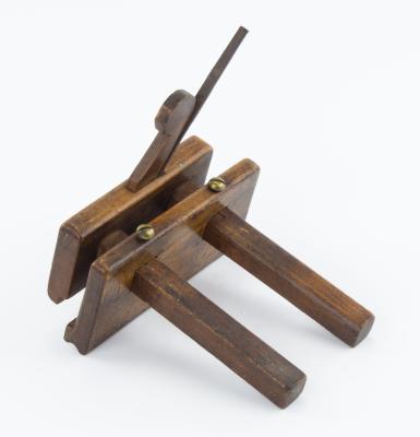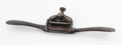 B68-602 FENCED COVE PLANE. Unmarked and almost certainly user made. 4-3/4" sole that cuts a 1/2" cove, fence is concave on underside which must have served some specialized purpose but we're not sure what. Brass locking screws on arms. Well made and unusual. From the collection of Jim and Becky Leamy. Good+ 50-100