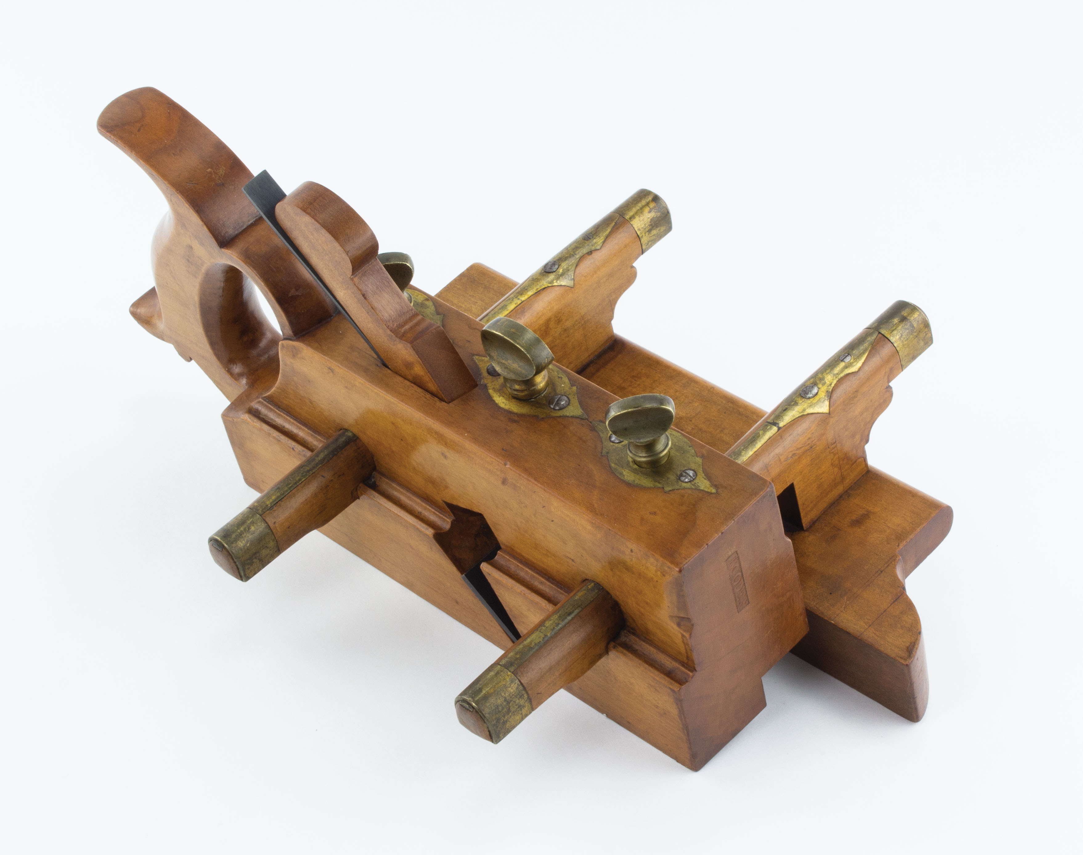 B68-610 SASH FILLETSTER PLANE. J. Coder. Five star maker from Bucks County, PA. Beech plane has decorative brass strips along tops of arms and around locking screws, tote and shoulders have decorative shape on underside, brass tips on arms. 1-3/4" skew cutter that may be modern replacement. Mild tarnish to brass; otherwise nice and clean. Rare. From the collection of Jim and Becky Leamy. Good+ 150-300