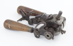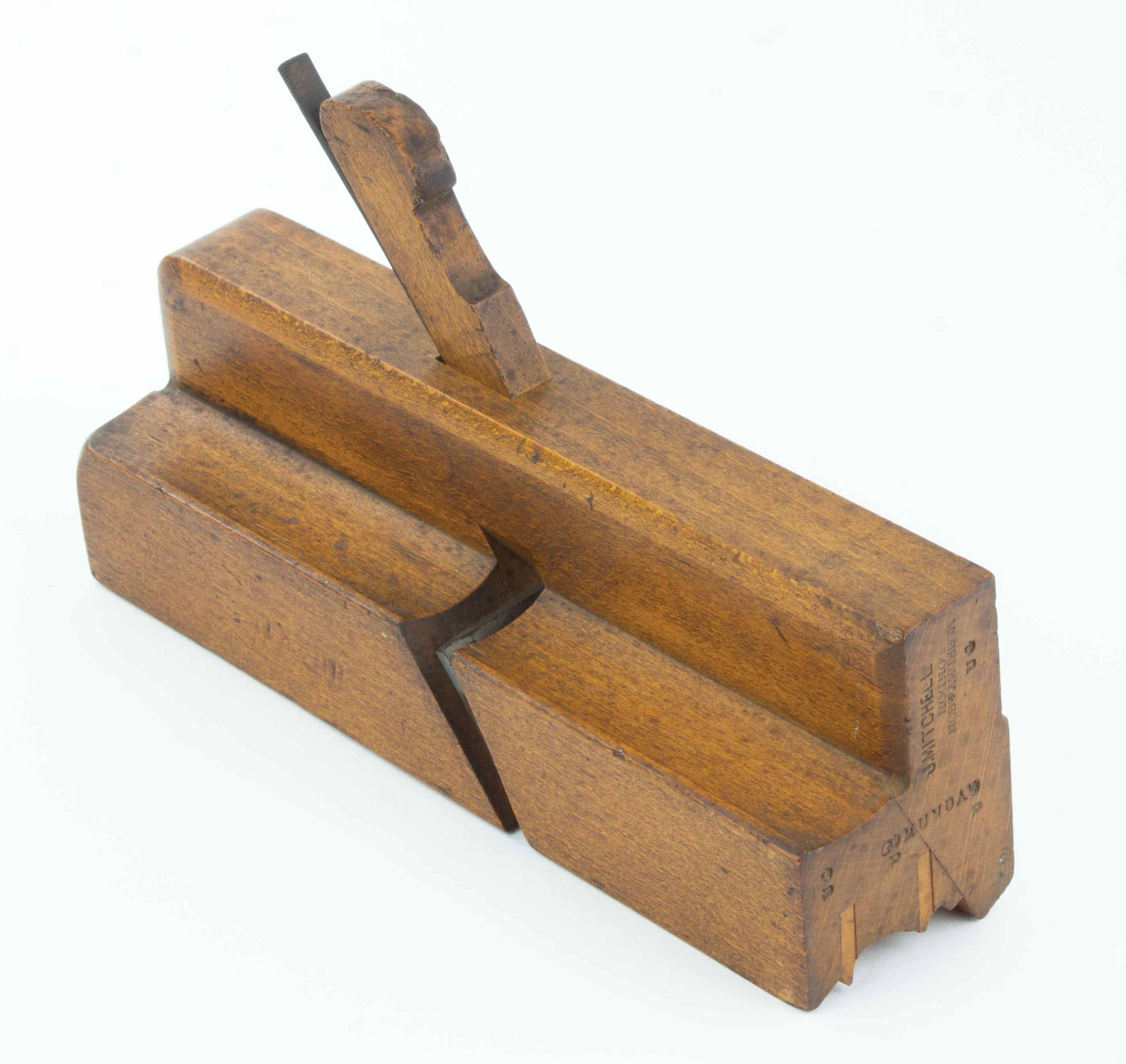 B68-613 BRITISH MOLDING PLANE. Moseley & Son. Cuts 1-1/2" quirk, ovolo, and bead, 2-1/2" wide overall, double boxed and spring marked with wide fence. Wood has very light wear with a few scratches and several user stamps. Good+ 75-150