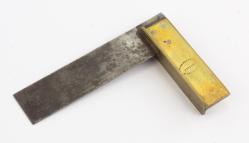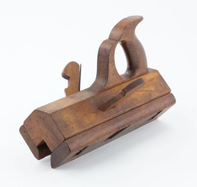 B68-622 SPECIAL PURPOSE PLANE. User made for a special purpose. Cuts a 1" vee profile with two separate cutters and two sliding fences angled toward sole. 10" long with closed tote. Marked only with initials "JMN". Wood has light wear but chips from both fences. Unusual and well made. From the collection of Jim and Becky Leamy. Good 100-200