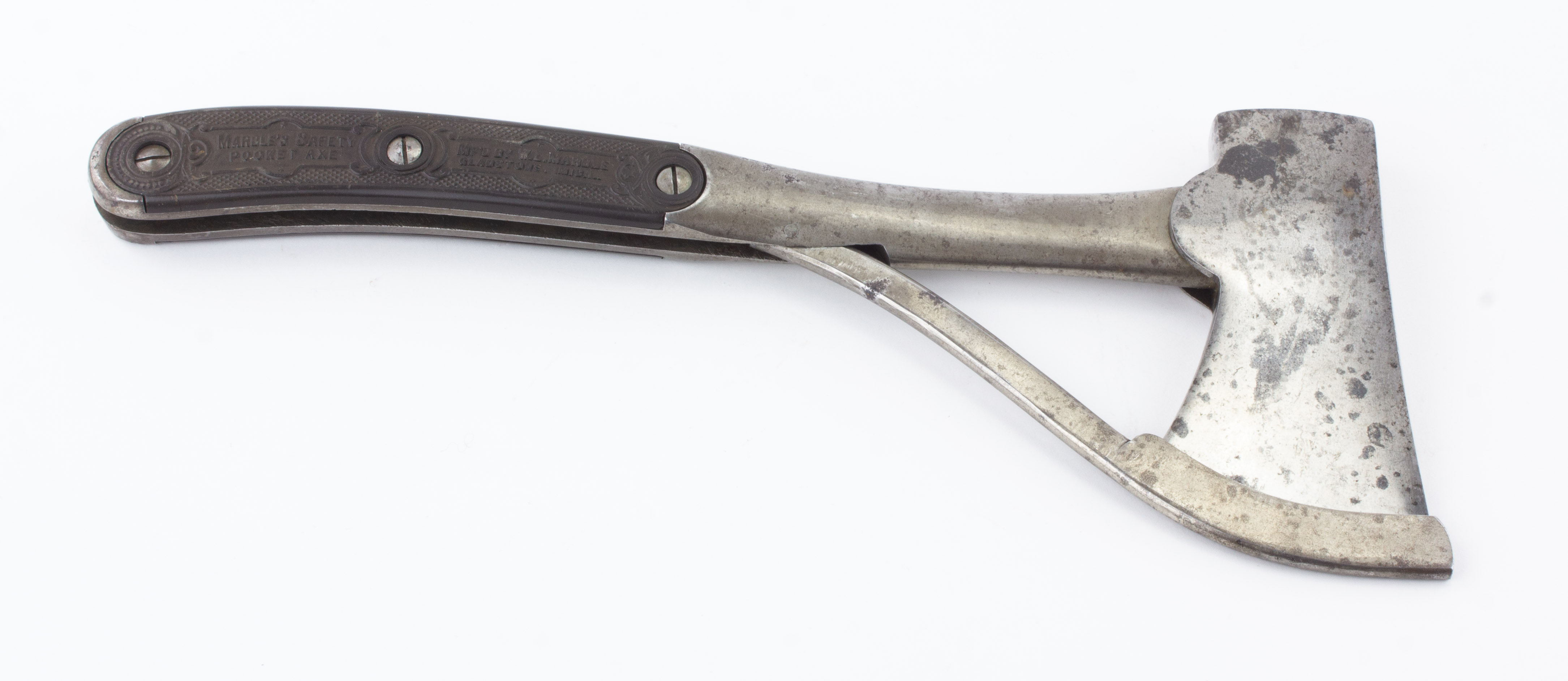 B68-627 HATCHET WITH BUILT IN GUARD. Marbles Safety Axe No. 3. Type 4 with "hound and hare" pattern Bakelite grips with, 11" long with 2-1/2" blade, clearly marked on head. The grips are like new, the metal has some surface oxidation but no rust or pitting. From the collection of Chuck Morgan. Fine 200-400