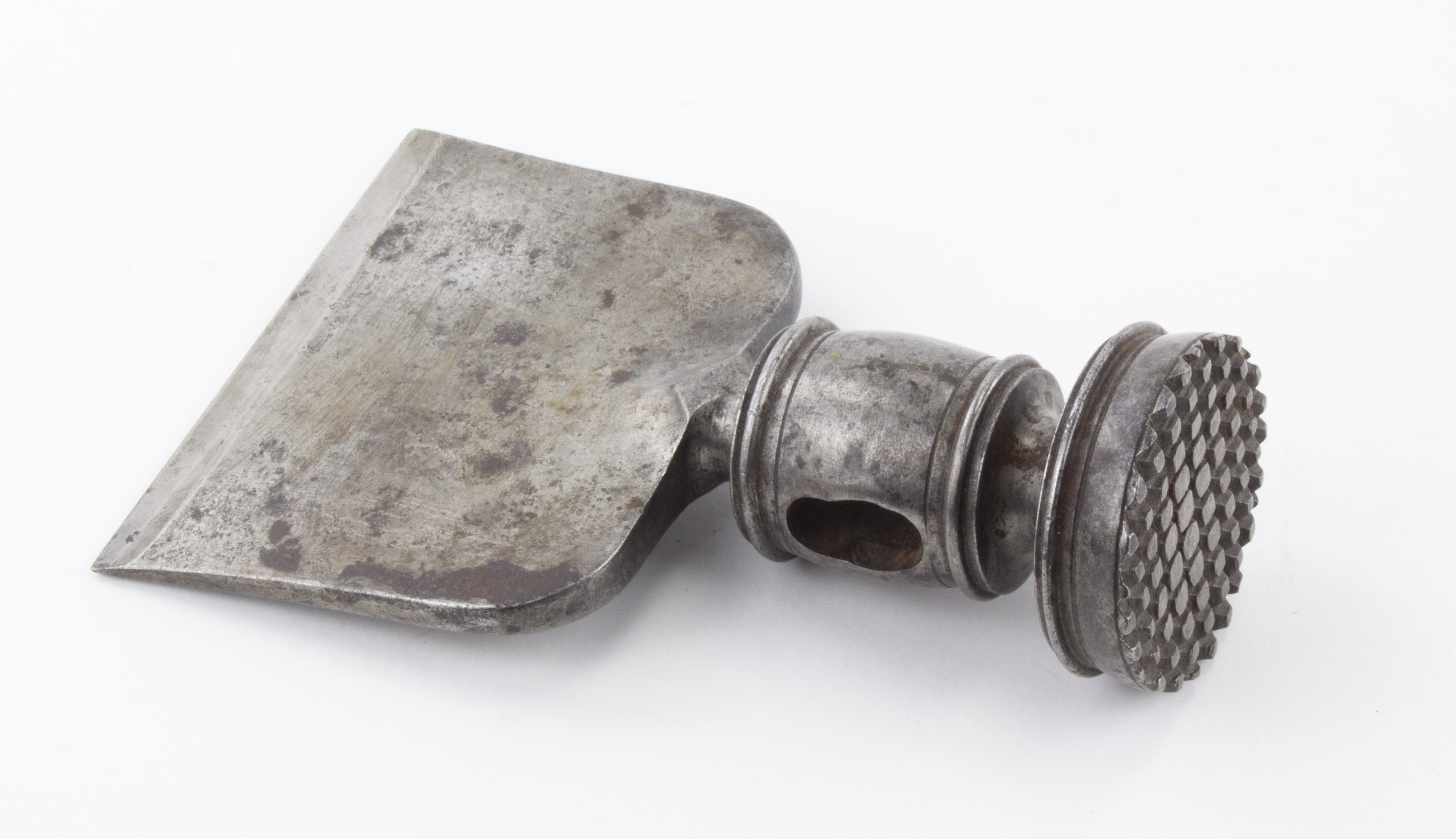 B68-628 SUGAR AXE HEAD. Smith made, and probably eighteenth century. The head is 6" long with 4" blade. Unfortunately the waffle pattern on the peen has been flattened somewhat, but it still has a beautiful design. Needs a handle. Good 100-200