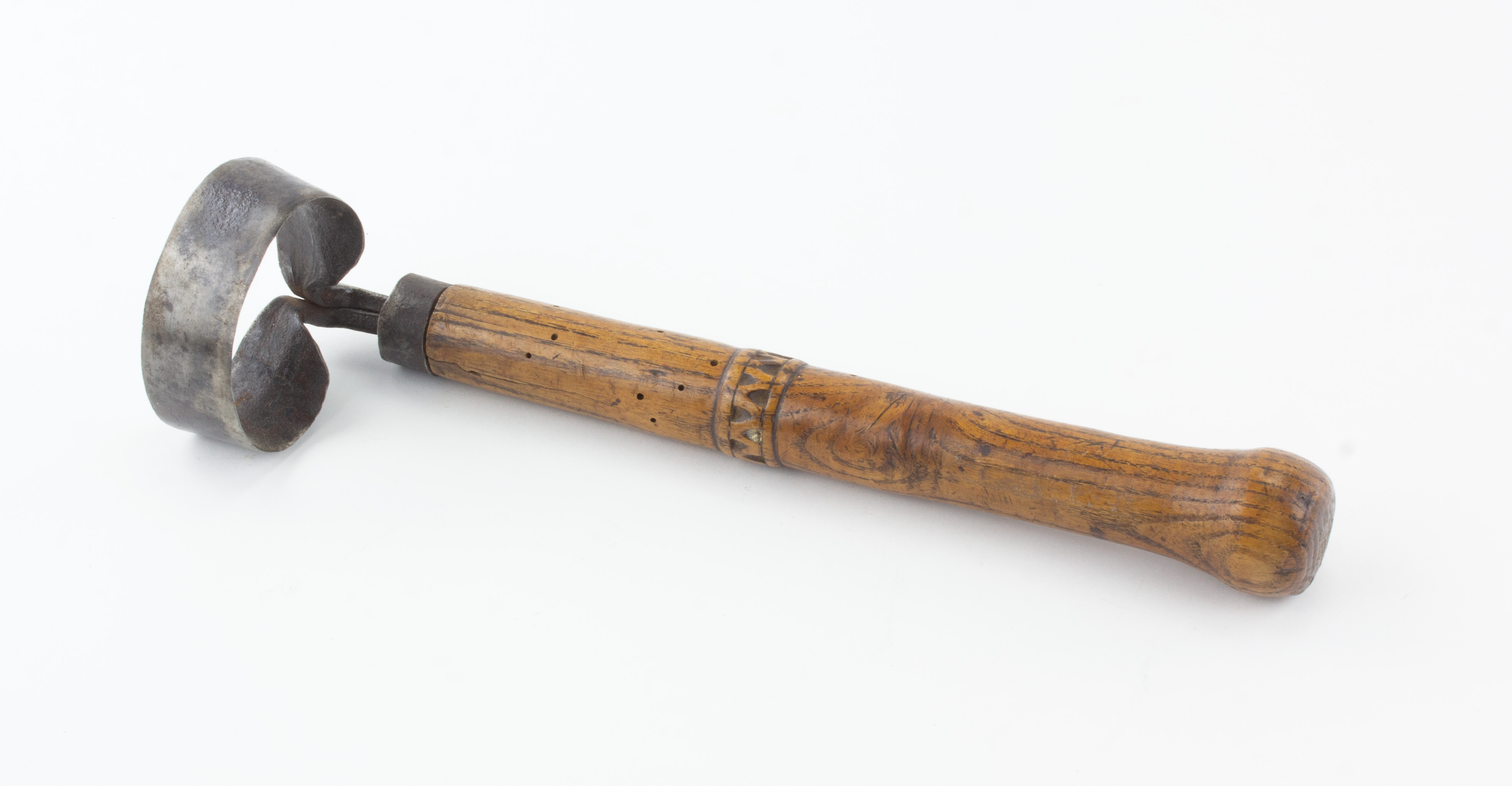 B68-629 CLOSED EUROPEAN SCORP. Smith made, with a touch mark inside the blade. 2-3/4" across. Unlike most scorps, it has a nicely carved 9" original ash handle with decorative details with a crack and some inactive worm. Good+ 100-200