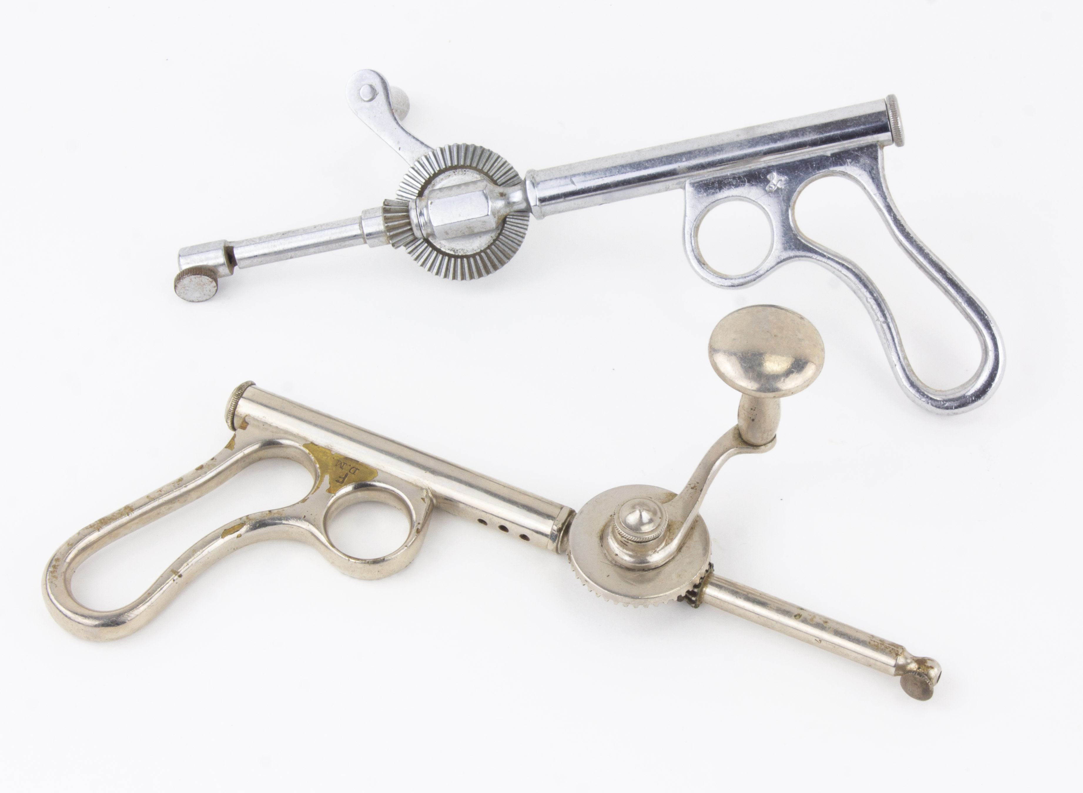B68-636 LOT OF TWO SURGICAL DRILLS. Pistol grip types, nickel plated brass and steel. One is marked "P&S" (or possibly "S&P"), the other unmarked. Both 8" long with bit compartments in body, one with bits included. Nickel is complete on the marked one and about 75% on the other, both work smoothly. From the collection of Jim and Christa Schoenky. Good & better 60-120