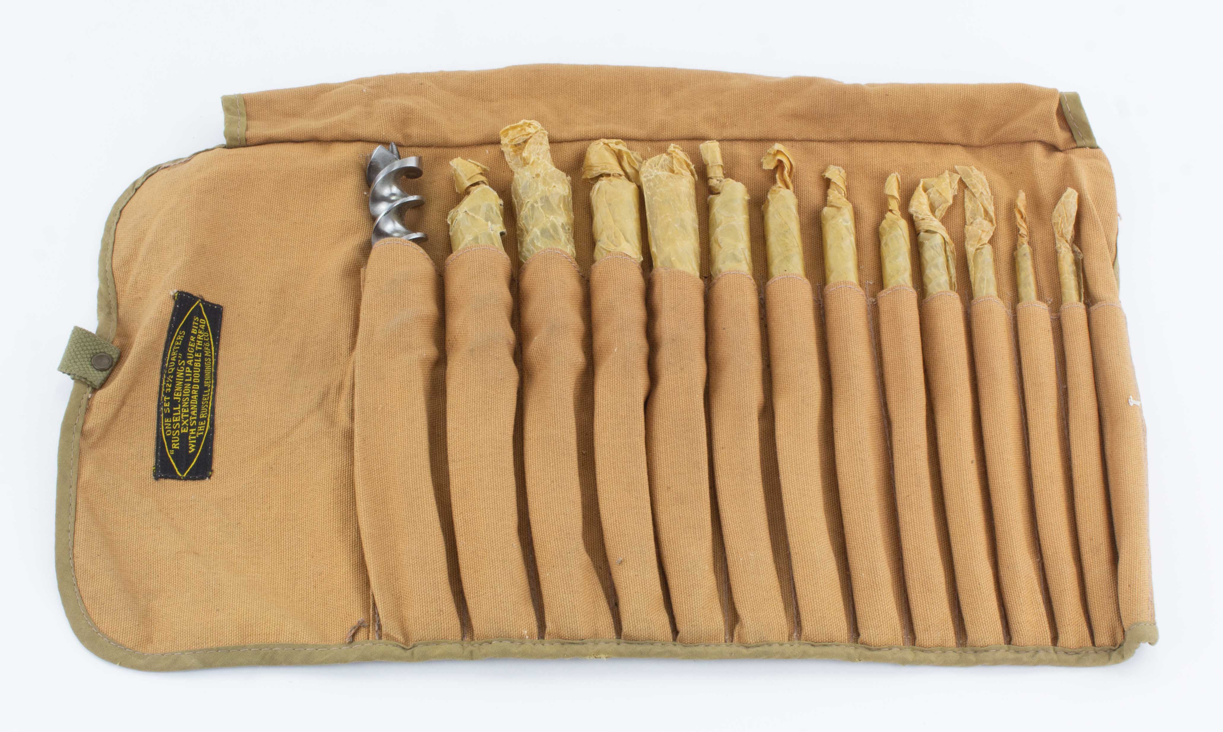 B68-645 AUGER BIT SET. Russell Jennings No. 32-1/2. Complete set of 13 bits, in new and unused condition, all but the 1" size still wrapped in their original waxed paper, in the original cloth roll with good label, fully intact. One of the nicest sets we've seen. Fine 120-240