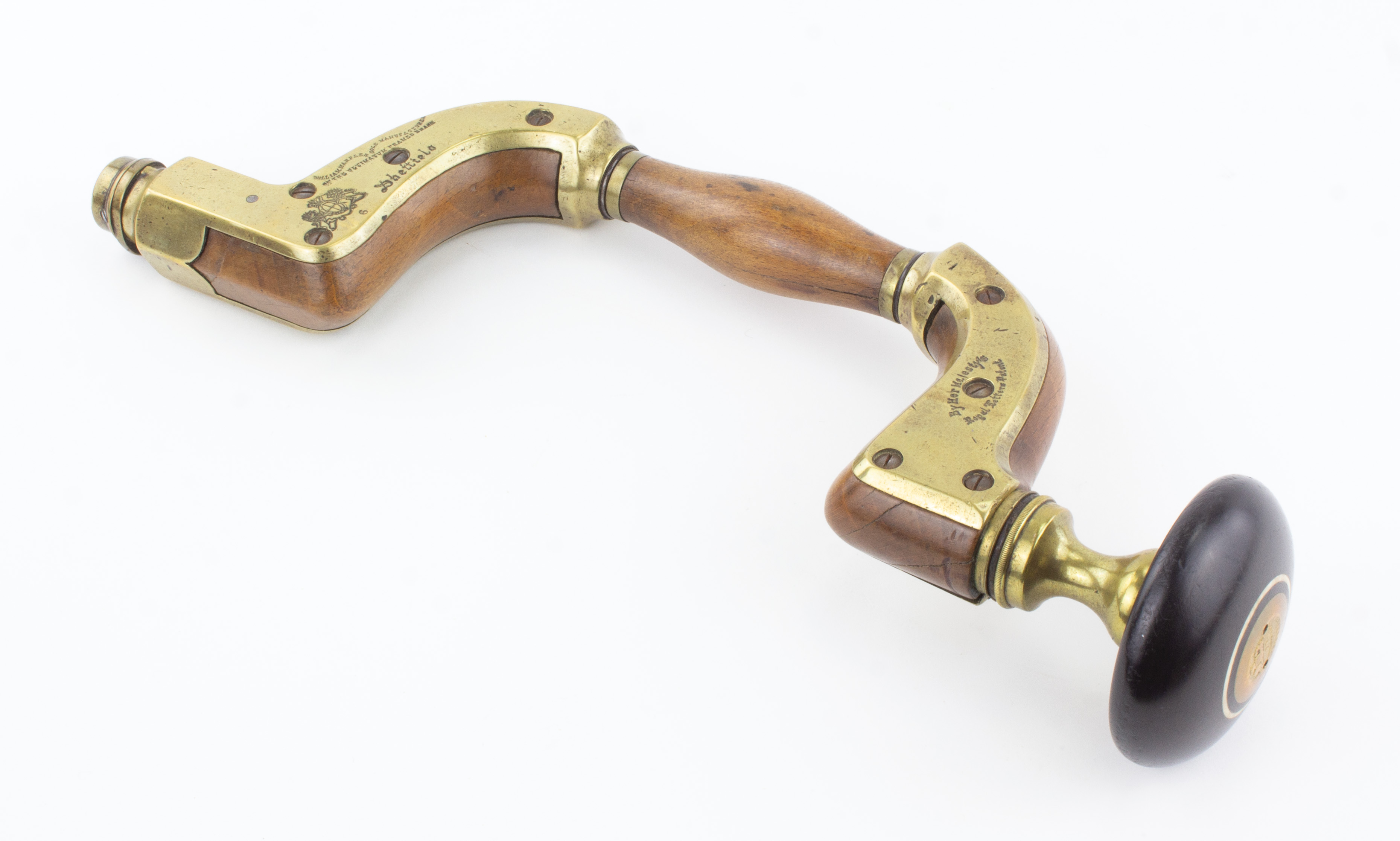 B68-646 FRAMED BRACE. William Marples Beech Ultimatum. Double ring pad type, 67 Spring Street medallion and stamp date it to 1854-55; good ebony head with complete ivory ring. There is some shrinkage in the fill and a crack in the grip but the wood is otherwise very clean; brass unpolished with only very light wear. Beech ultimatums are paradoxically much less common than ebony. From the collection of David Jeffers. Fine 500-1000