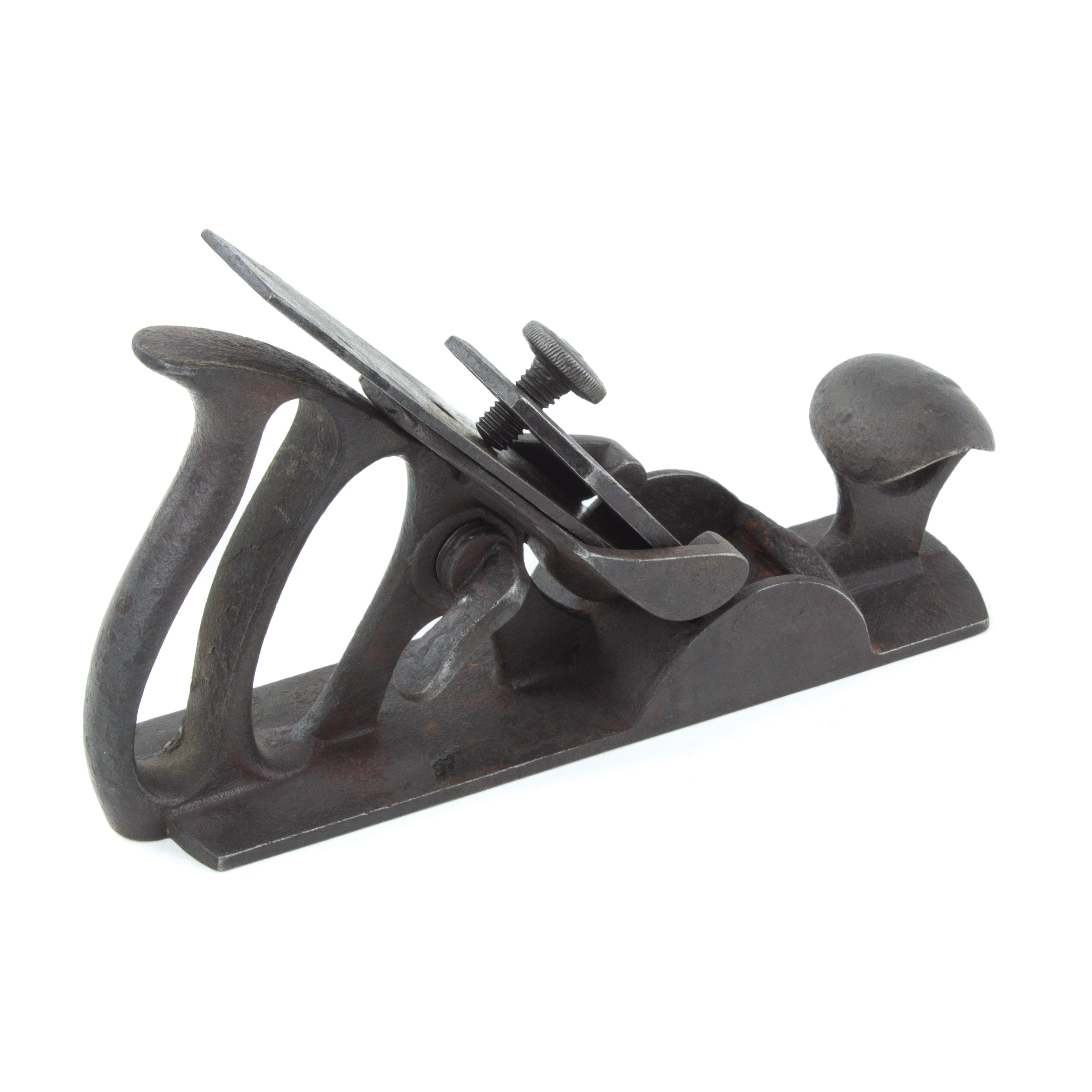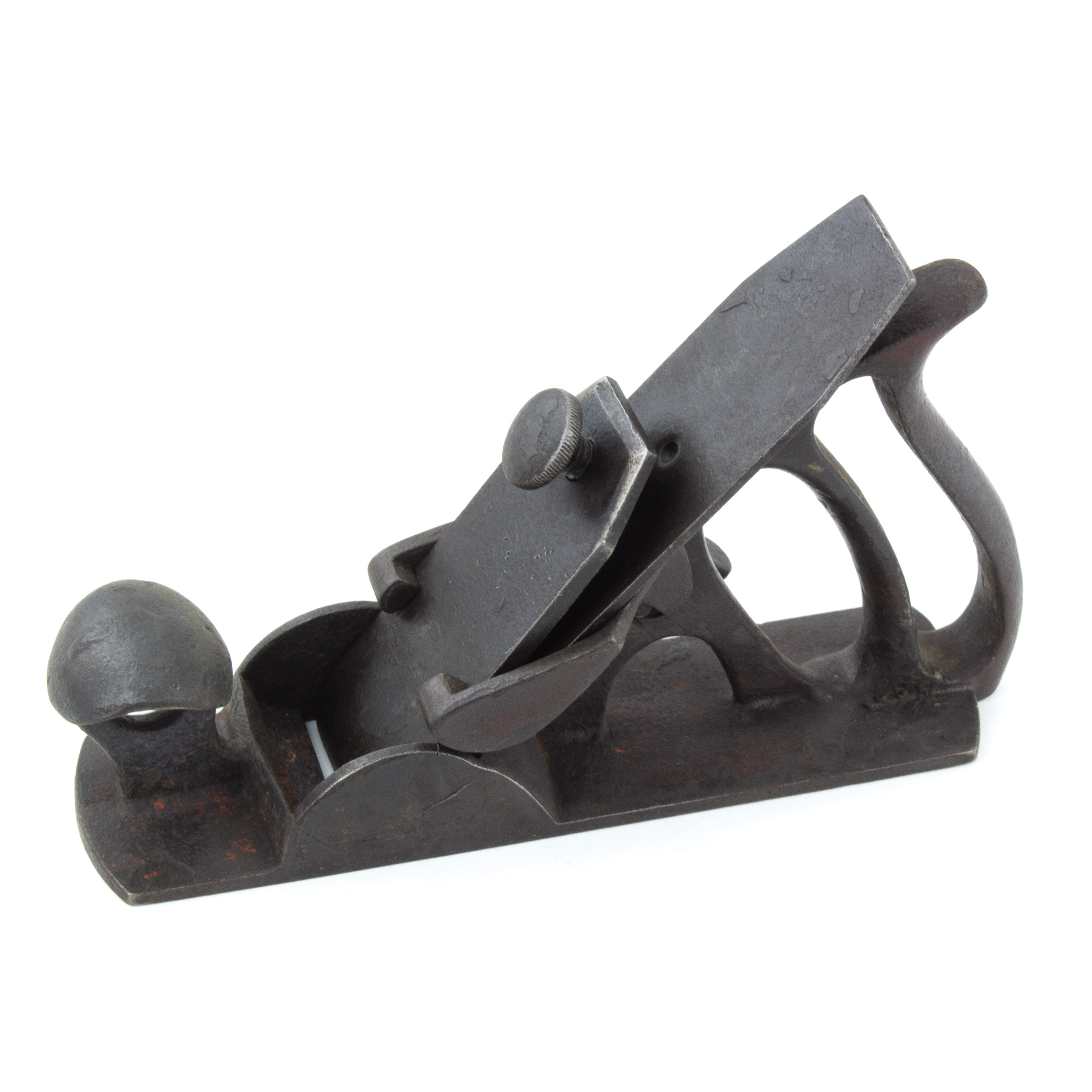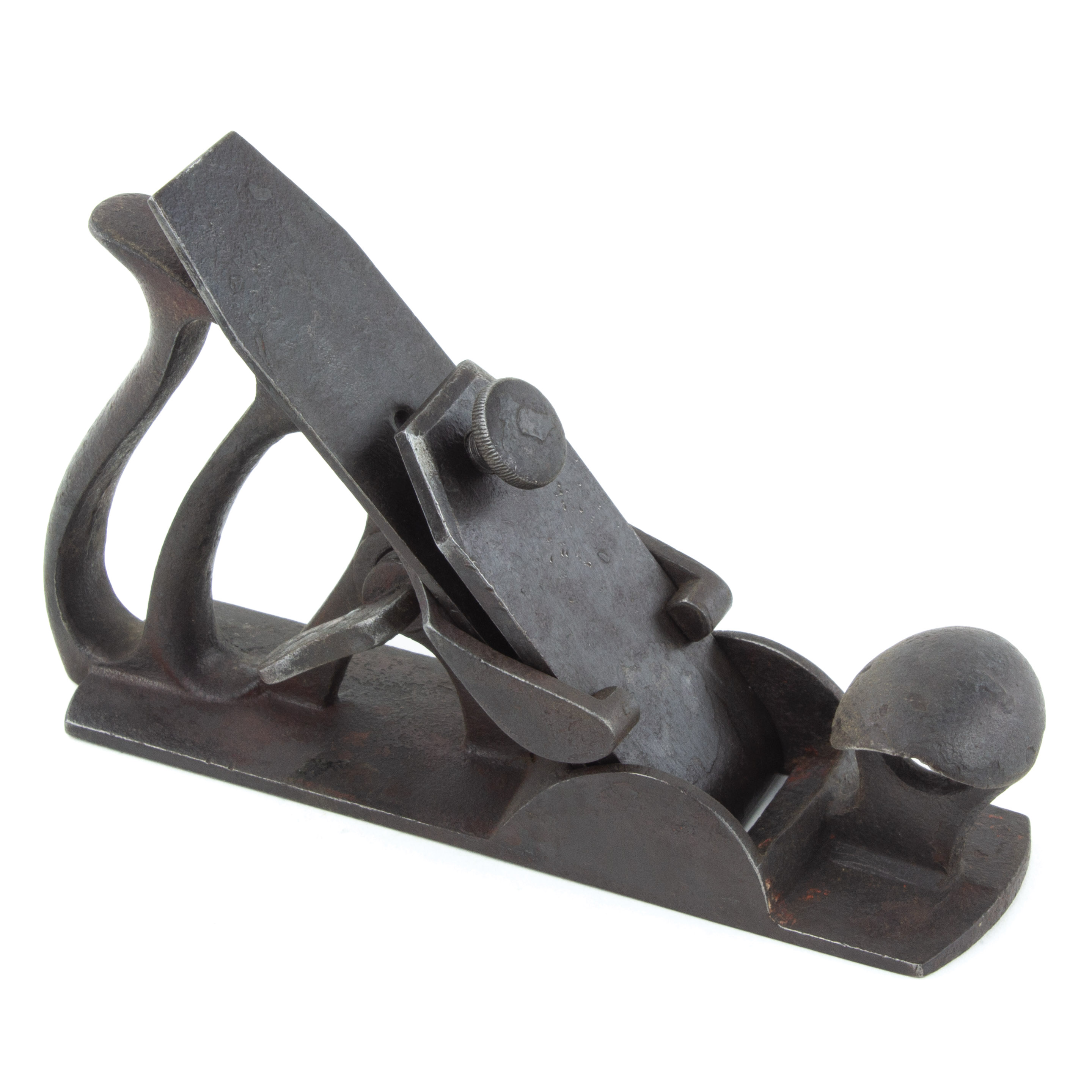 B68-650 SMOOTHING PLANE. Birmingham Plane Co. Decent example of the planes based on George Mosher's 1884 patent, in the smallest size with a 6-3/4" sole and 1-1/2" cutter. Has the clamp-type cutter holder (PTAMPIA I, figure 233b), cutter is original but no visible mark; some chipping to the depth adjusting rack that doesn't show when the cutter is in place. Crack in the left cheek where it looks like it was dropped. The No. 1 of Birmingham planes. From the collection of Harold Unruh. Good 400-800