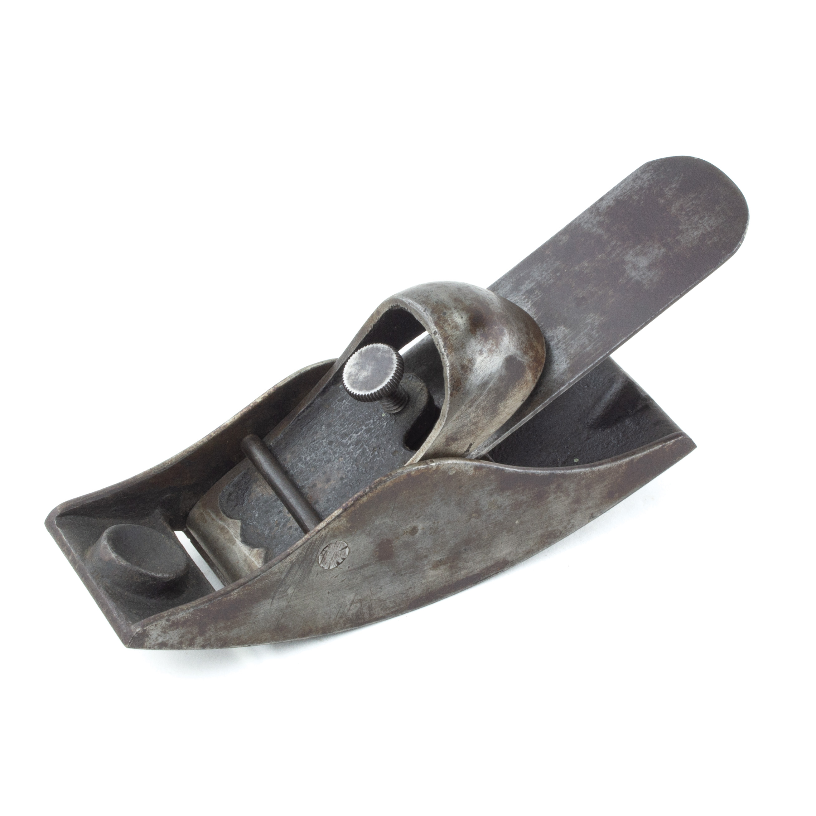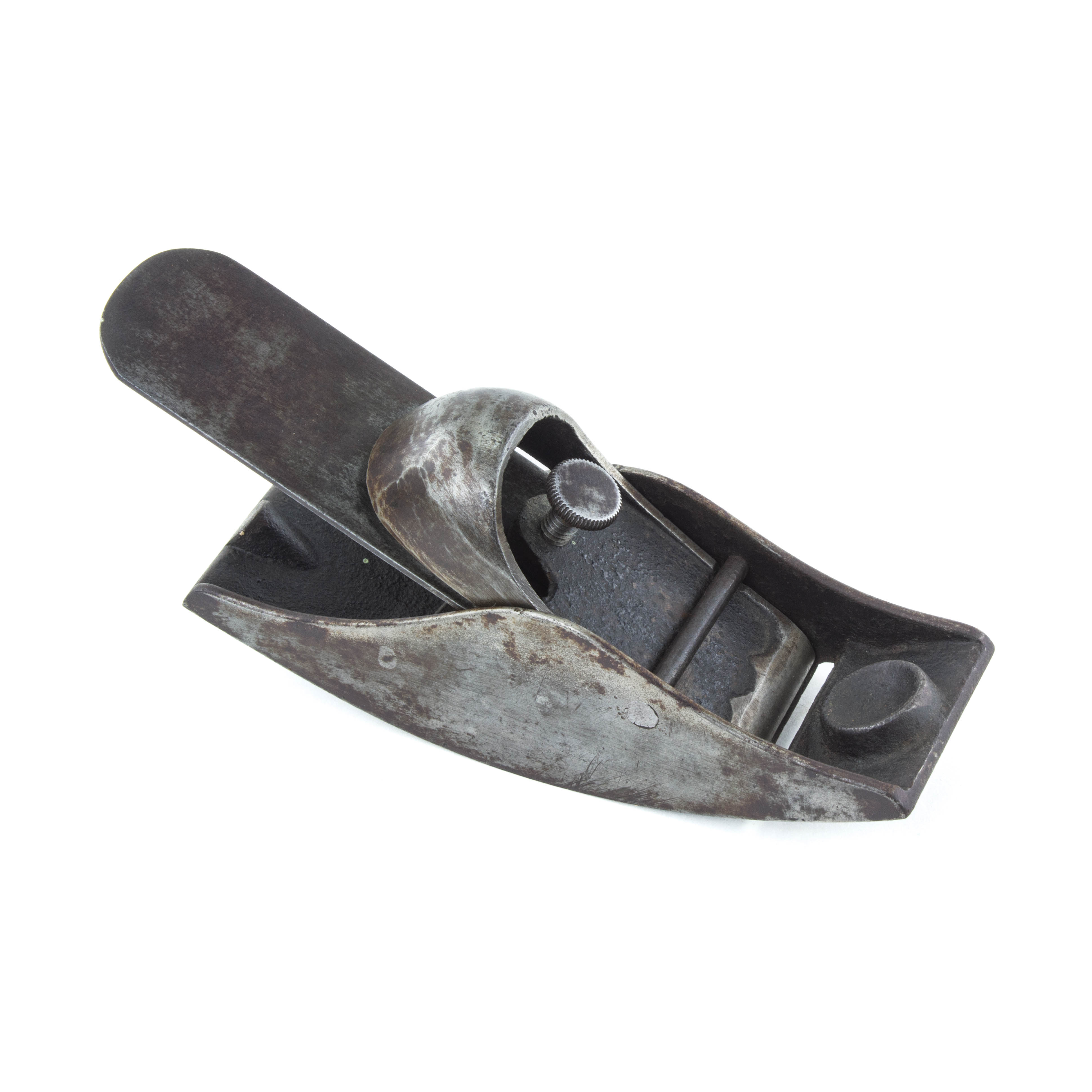 B68-652 COMPASSED SOLE BLOCK PLANE. The lever cap looks like the block planes made by Meriden Malleable Iron Co. (PTAMPIA I, Figure 252), but it's completely unmarked and we've never seen one before. 7" long with 1-5/8" cutter. Japanning 75%, metal very clean. From the collection of Harold Unruh. Good+ 120-240