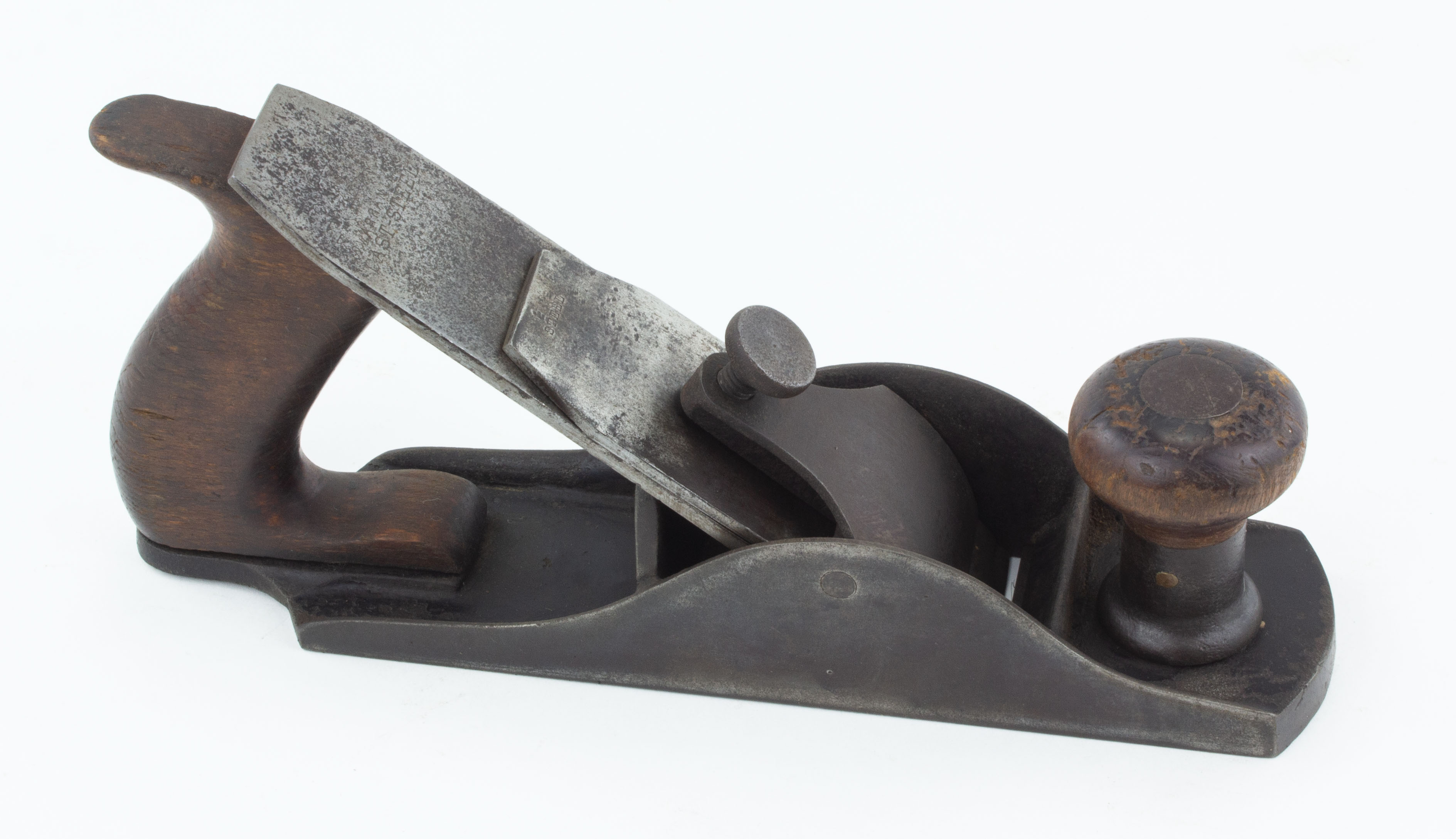 Nice clean example of the "Perfected" line in the 8" smoother size, based on Palmer & Storke's 1871 patent. The cutter is not adjustable, and this model is actually much harder to find than the later models with elaborate adjustment mechanisms. Adjustable throat, corrugated sole, applewood tote and knob with moderate wear, marked on the left cheek, original marked cutter with mark obscured by surface corrosion. See PTAMPIA I, pp. 172-73. From the collection of Harold Unruh. Good 100-200