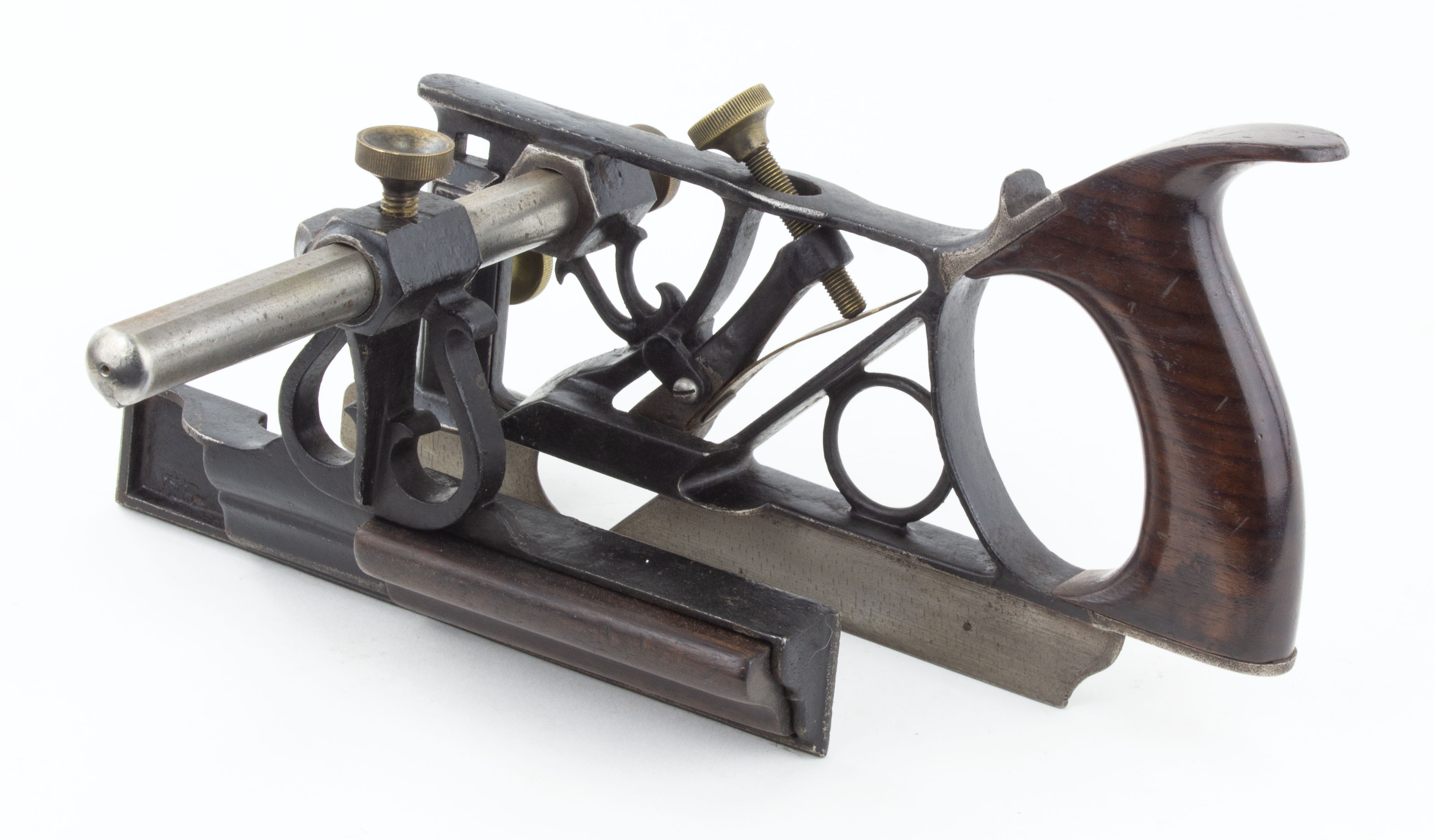 B68-655 IRON PLOW PLANE. Phillips Patent. Earliest version with rosewood trim and unmarked skate (left example in plate 16 of PTAMPIA I). Japanning 90%, wood has very light wear, no cutters. From the collection of Harold Unruh. Good+ 300-600