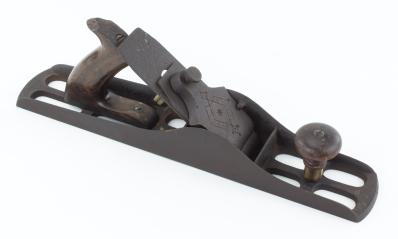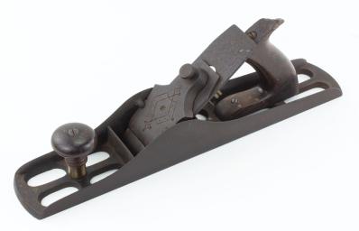 B68-656 JACK PLANE. Cyrus Hardy Patent. 15" version of the very rare Hardy patent sold by Boston Metallic Plane Co., with its large holes in the sole that reduced friction but increased breakage. The lever cap is original with its geometric pattern but nickel plating is long gone, metal has overall surface corrosion with some light pitting, large chip from end of tote. From the collection of Harold Unruh. Good 200-400
