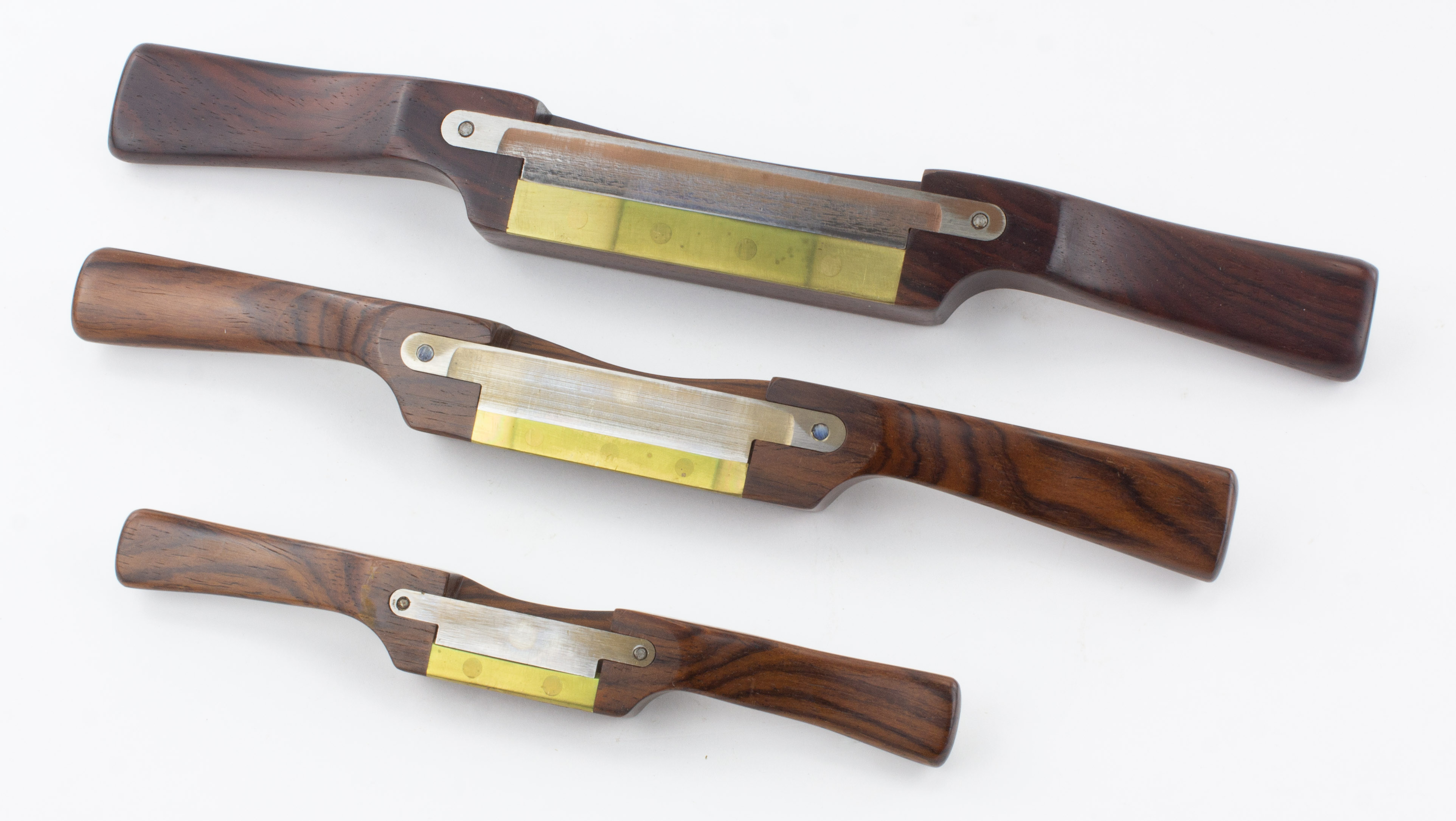B68-672 LOT OF THREE SPOKESHAVES. All with rosewood bodies, 13-1/2", 12" and 8" in length. Unmarked but clearly by the same maker (likely Bill Webber himself) and very nicely made, in mint condition. From the collection of Bill Webber. Fine 100-200