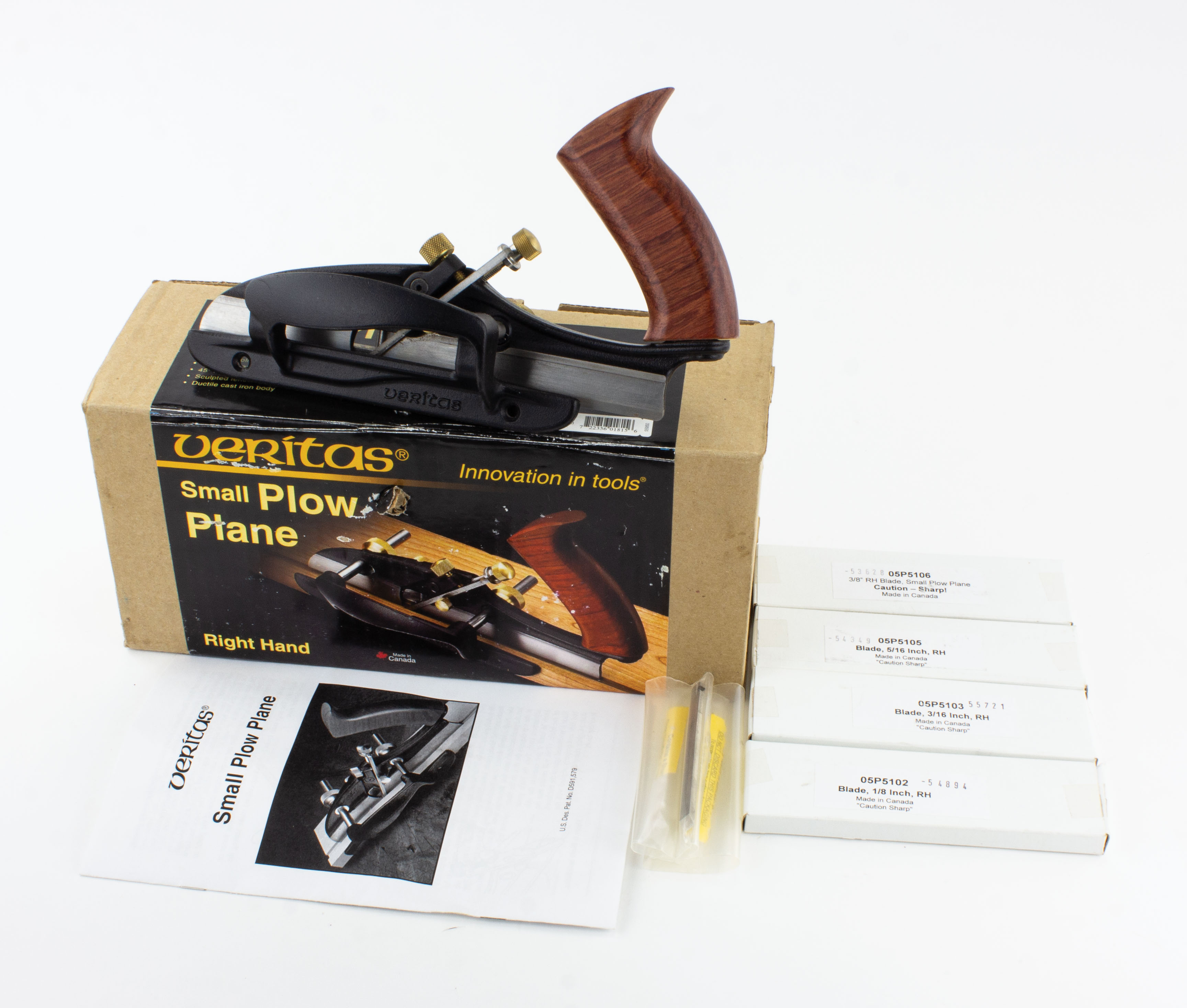 B68-679 MODERN MAKER. Veritas Plow Plane IOB. Small right handed plow plane with 7" sole, cast iron body. Includes four extra blades in original packaging and instruction sheet. Box has light wear but tool is near mint. Fine 200-400