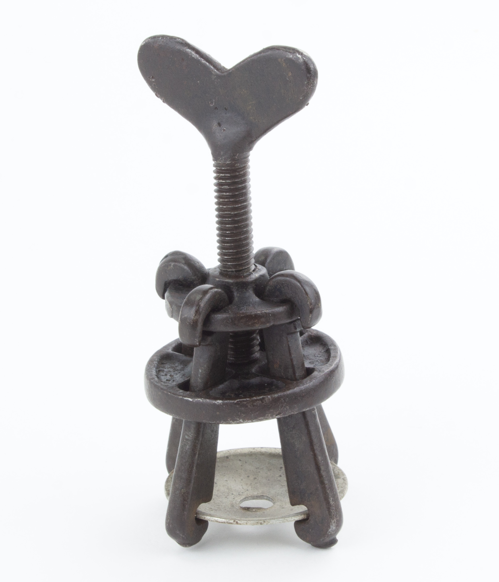 B68-683 HAND VISE. Has jaws shaped to hold round object, possibly a watchmaker's tool. 5" tall, japanning near complete. " Pat'd Jan 3 1893" cast on underside but we can't find the corresponding patent. Works smoothly. From the collection of David Jeffers. Good+ 50-100