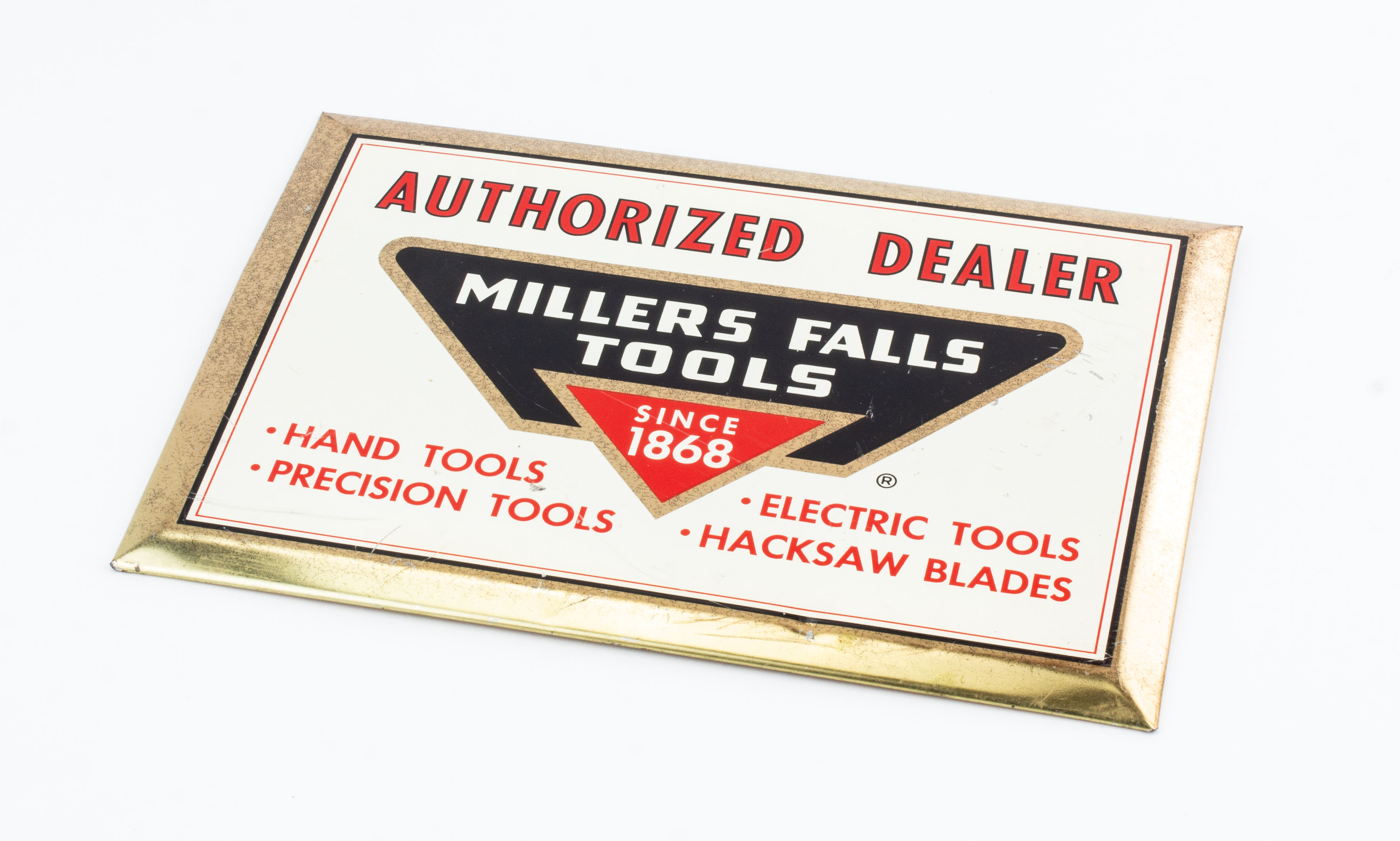 B68-685 HARDWARE DISPLAY. Millers Falls. 10" by 6-3/4" tin sign with pasteboard backing that has a stand and hanging loop. Lettering very clear and complete. From the collection of Jim and Christa Schoenky. Good+ 40-80