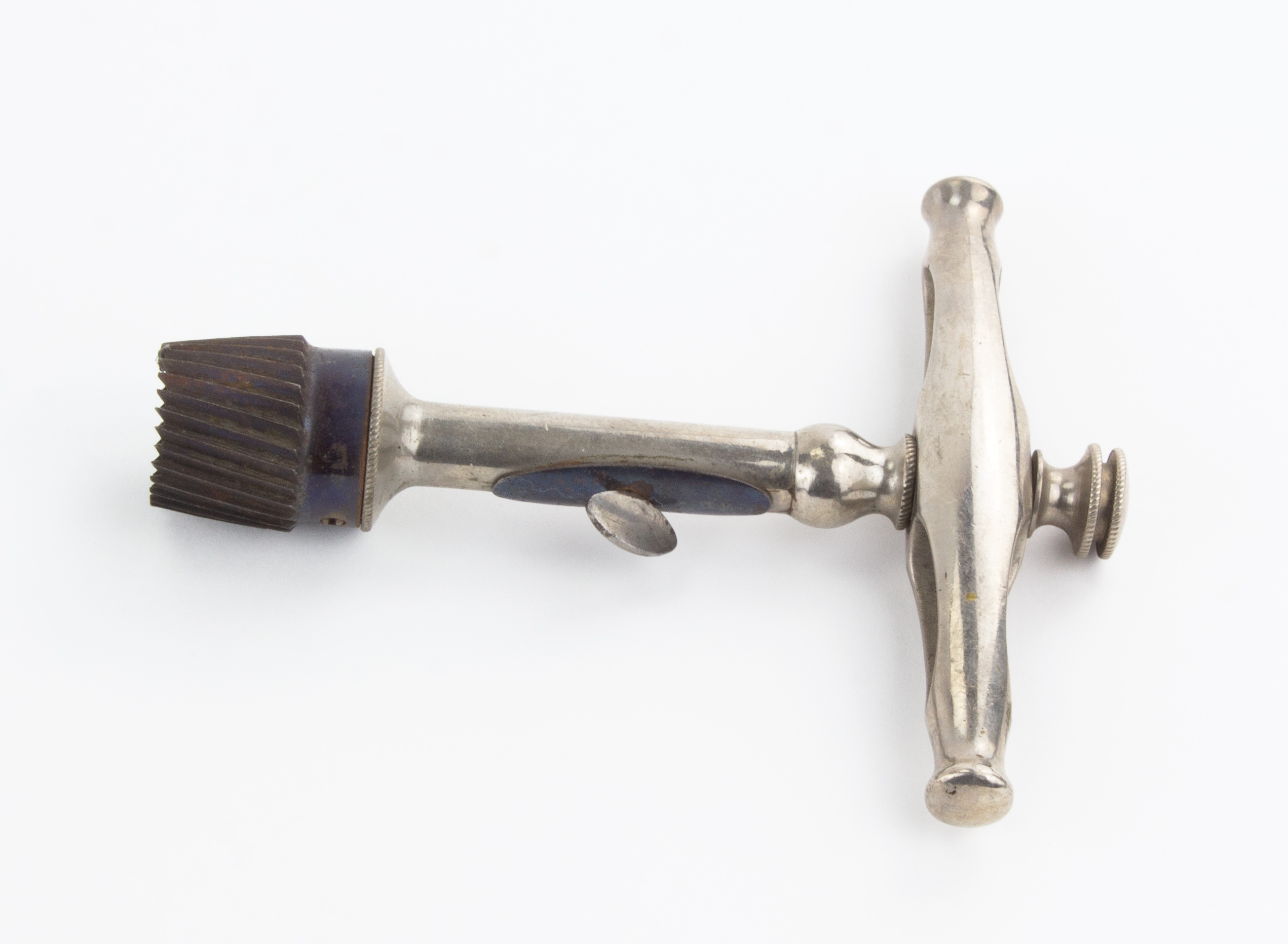 B68-688 MEDICAL TREPANNING TOOL. Unsigned, probably early nineteenth century. 4-1/2" long with 3-1/2" handle, plated brass. Good clean condition. Just the thing for do-it-yourself brain surgery. From the collection of Jim and Christa Schoenky.