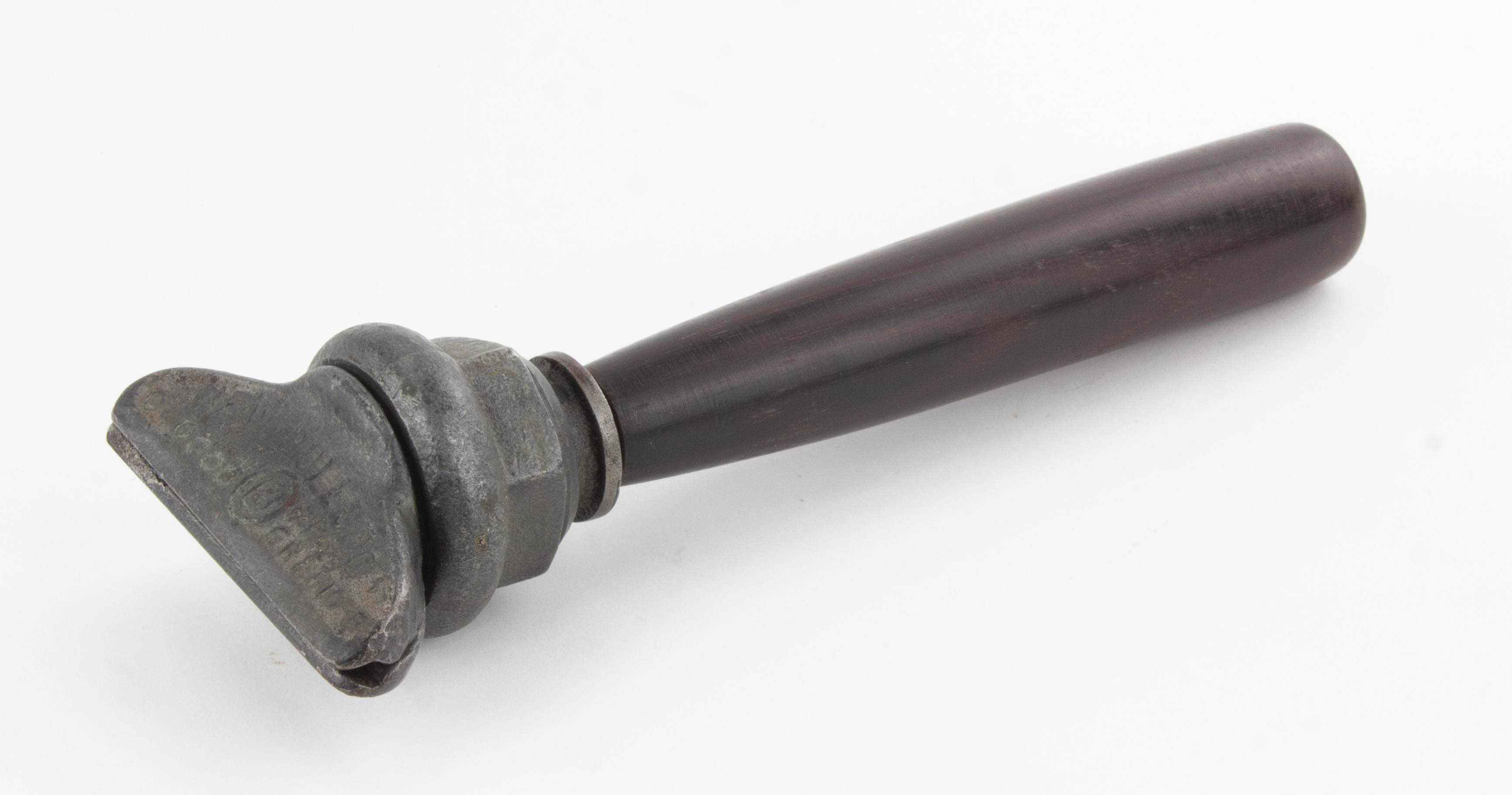 B68-689 HAND VISE. Bulldog. 8" long with a 3" jaws, tightened by a sliding nut. Has "Bulldog" and an illegible patent date cast into head. Metal has light corrosion but works smoothly. From the collection of David Jeffers. Good 40-80