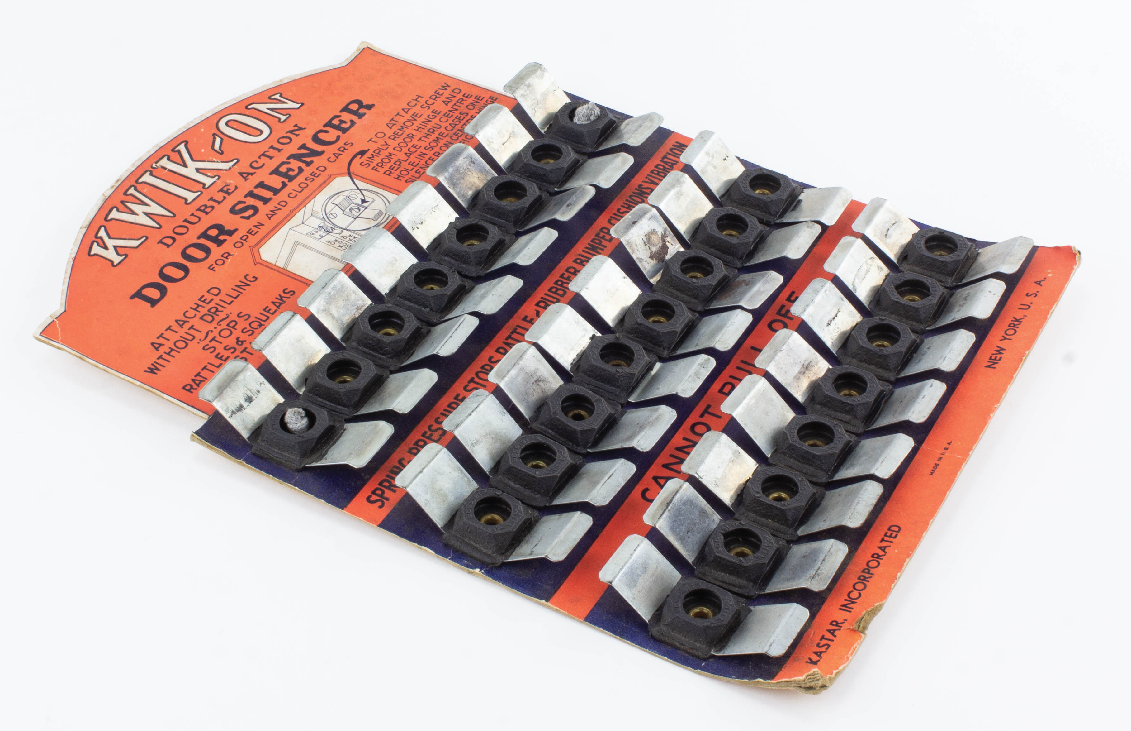 B68-695 HARDWARE DISPLAY. Kwik-On Door Silencer. 24 examples on original hanging 15" by 10" cardboard display. Has light wear with some damage to edges. From the collection of Jim and Christa Schoenky. Good 50-100