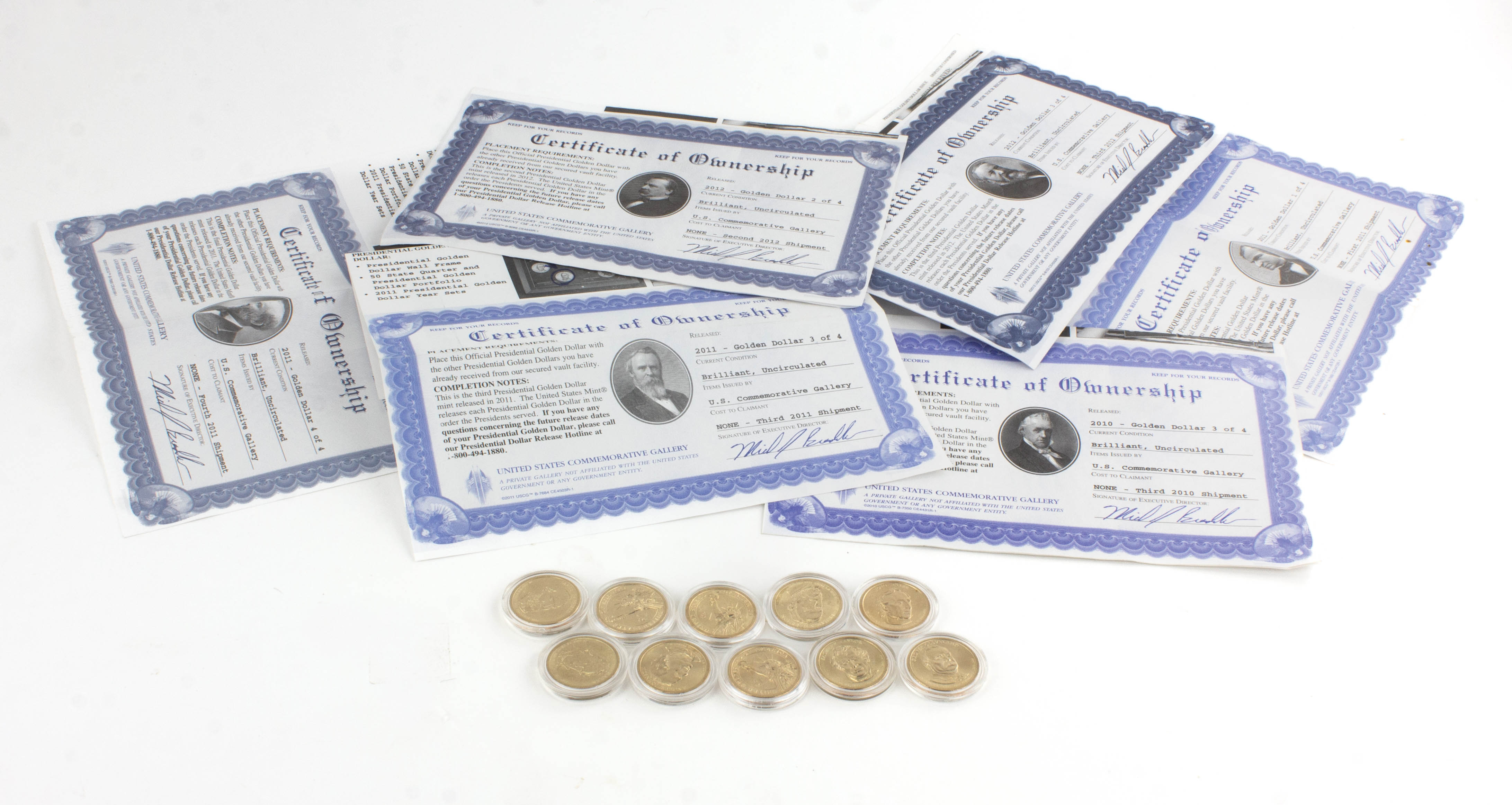 B68-696 LOT OF COMMEMORATIVE PRESIDENTIAL GOLD COINS. Ten total: Taylor, Tyler, Buchanan, Lincoln, A. Johnson, Grant, Hayes, Garfield, Cleveland, B. Harrison. Each is in its original plastic case, and none are missing the edge lettering. These were issued between 2007 and 2011 to honor all of the presidents through Bush I, and are legal tender with a face value of $1 each, maybe a little more if you want to collect to entire set. The lot also includes some miscellaneous certificates of ownership. They're not actually gold so don't buy them to melt down. Fine 30-60