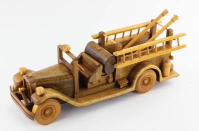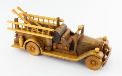 B68-702 WOODEN FIRE TRUCK. Bill Chase. Model of a 1933 Seagrave fire truck; made primarily from Padauk wood, with wheels and trim from a lighter wood. Includes two ladders and two fire hoses. 17" long and 6" high. Signed and stamped on the bottom by artist Bill Chase. Tiny split in one cross-bar, otherwise like new. Fine 50-100