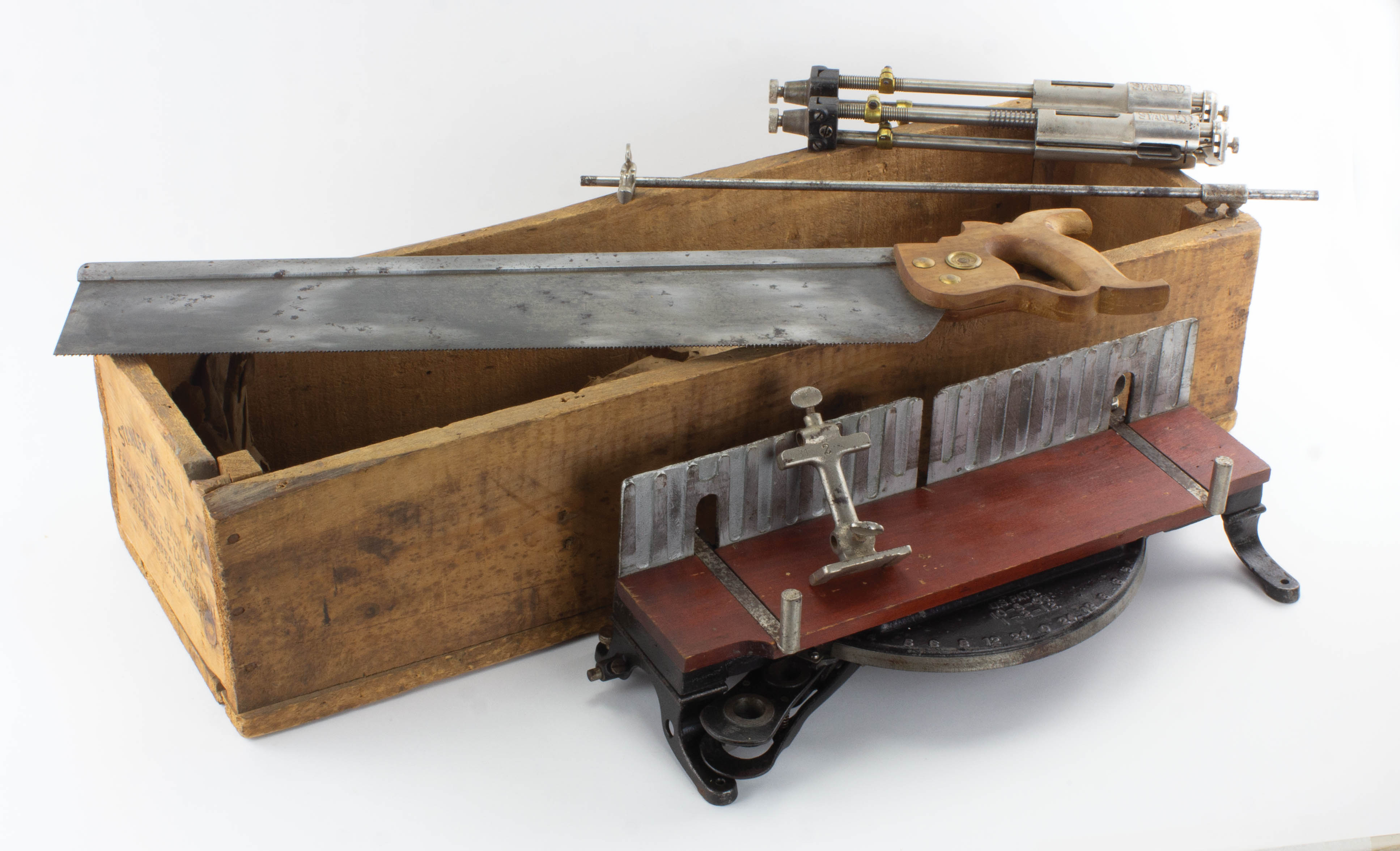 B68-704 MITRE BOX. Stanley No. 244 IOB. 18" long with 4" capacity, includes all attachments in original wrapping paper. Includes original 22" backsaw with Stanley sweetheart mark on blade. Finish worn off saw handle, some light spots of corrosion. In original wood shipping crate with Stanley stamp on end, missing lid. Good+ 100-200