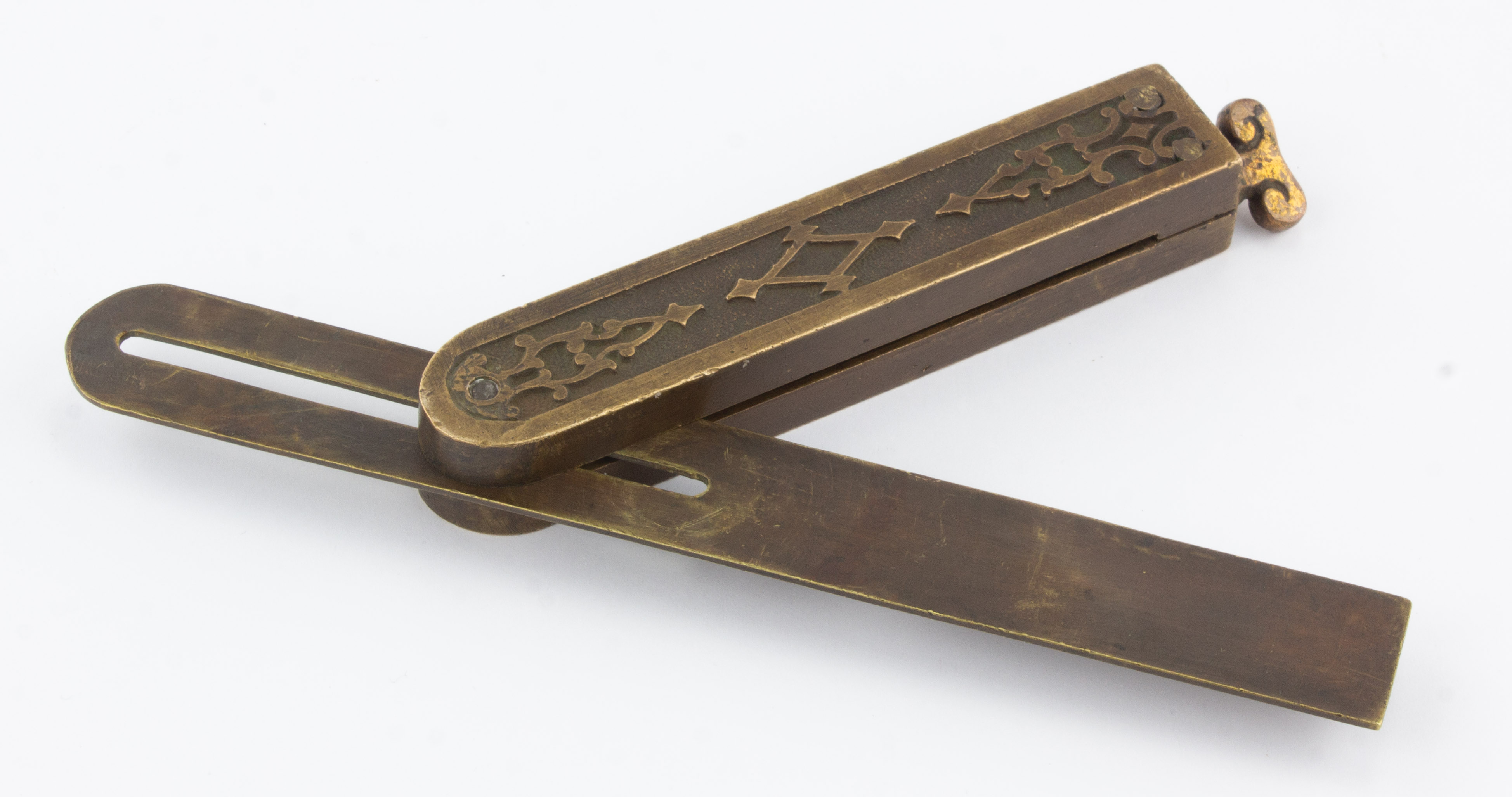 B68-709 SLIDING T-BEVEL. Elaborate Brass Handle. Unmarked and Steve's notes speculate that it may be European, but to our eye it resembles a more elaborate version of the brass handled bevels patented by George Miller and manufactured by Detroit Bevel & Divider Co. 5" handle with decorative casting that is more elaborate than the typical Miller patent and brass locking screw with decorative shape, 8" square cut brass blade. The brass is oxidized with some dinging along the edges of the handle. From the collection of Steve Dice. Good+ 150-300