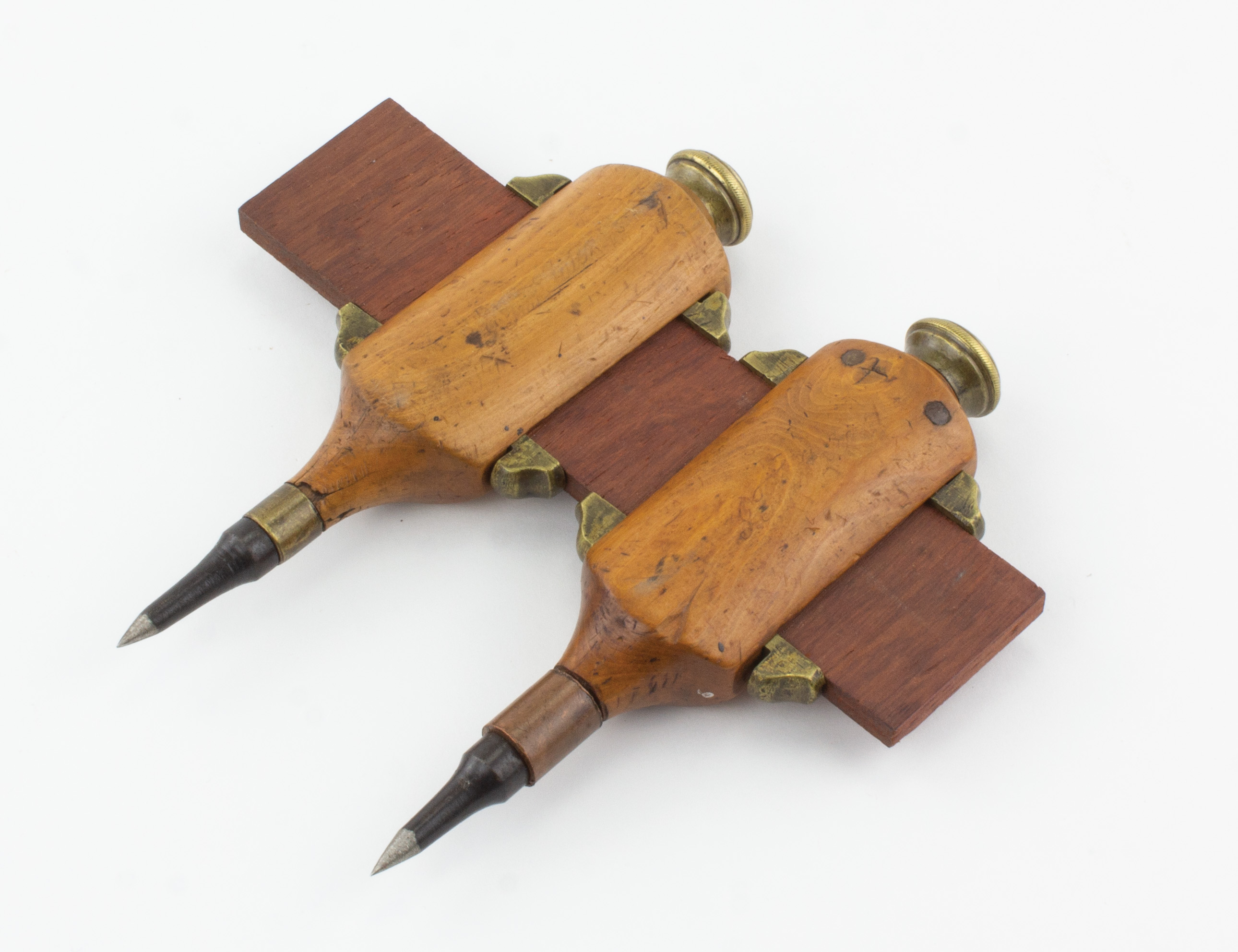 B68-710 SET OF FANCY TRAMMEL POINTS. Wooden bodies with steel tips and brass locking screws. 6" long with upper and lower brass keepers, mounted on 6-1/2" mahogany bar. Light surface wear. From the collection of David Jeffers. Good+ 100-200