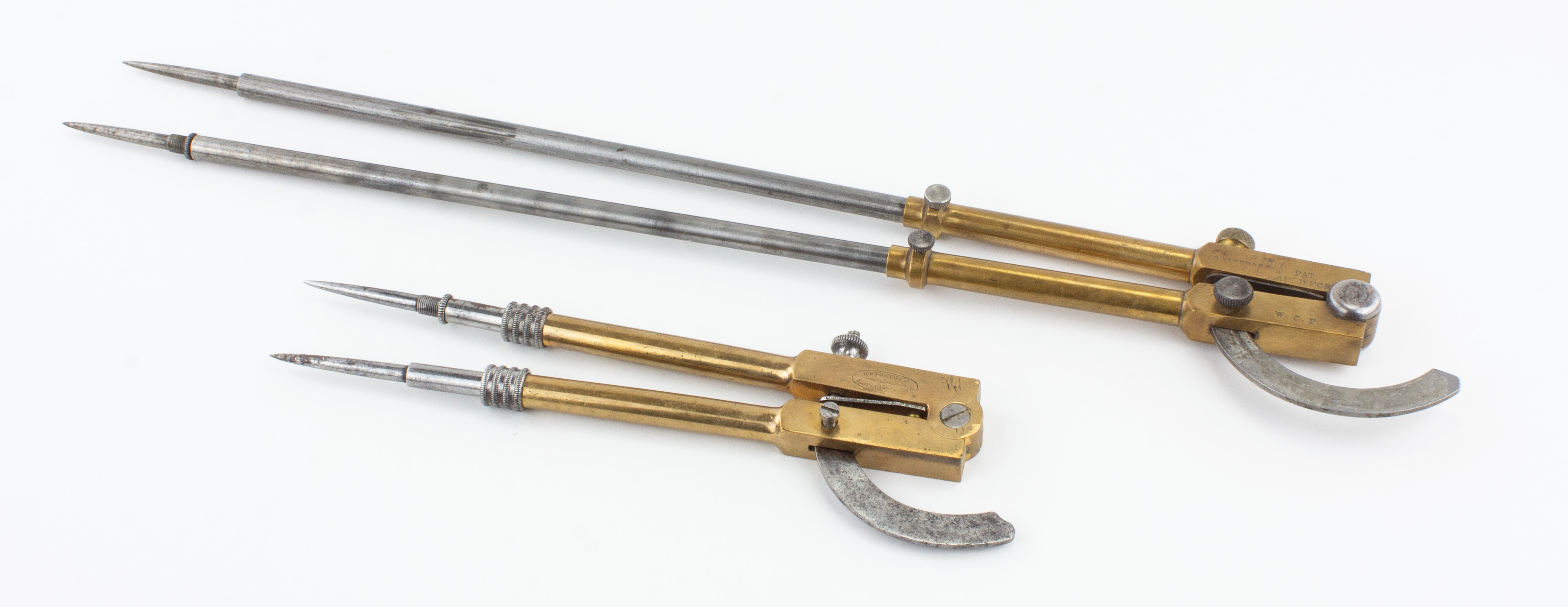 B68-718 LOT OF TWO BRASS DIVIDERS. O. Stoddard. Oscar Stoddard of Detroit received this patent on 8/26/1872 for a caliper with extendible legs with inserts that could be reversed to hold a pencil. One is 8" long with an oval Stoddard trademark including the patent date. The other is 16" long and is an earlier version marked only "Stoddard" and "Patent Applied For." The earlier version has the points locked with set screws as shown in the patent; the later version uses compression nuts. Both with brass bodies and steel tips. Metal has light wear but overall clean. Good+ 100-200