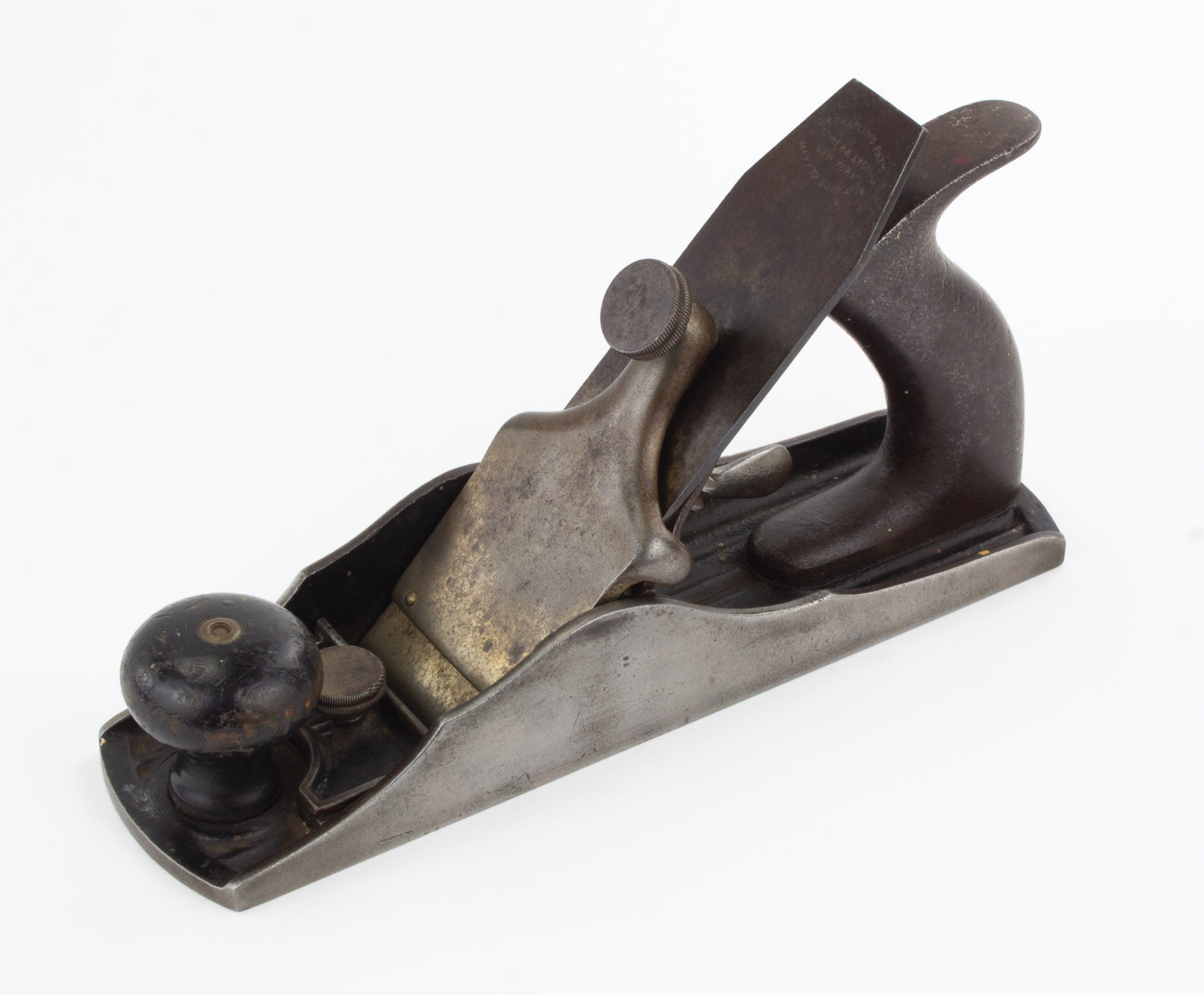 B68-734 CORRUGATED SOLE SMOOTHING PLANE. Tower & Lyon No. 1255. Based on Chaplin's first 1872 patent and manufactured by Tower & Lyon. Original cutter marked with the dates both for the Chaplin's patent and Tower's 1876 patent for the cast iron tote, but the design is actually Johnson & Torkelson's 1888 patent with the adjustable throat. See PTAMPIA I, Fig. 192. 9" corrugated sole, 2" cutter. Light rust on cutter and some pitting on tote, 70% nickel loss on lever cap, light wear to knob, otherwise very clean. The throat adjustment was awkward to use and expensive to make; only a small number of the Chaplin patent planes include this feature. From the collection of Harold Unruh. Good+ 200-400