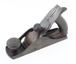 B68-739 SMOOTHING PLANE. Unmarked and appears user made with shoebuckle type lever cap. 8-1/2" sole, 2" Auburn Tool Co. cutter. Large chip from knob, metal oxidized. Unusual. From the collection of Harold Unruh. Good 125-250